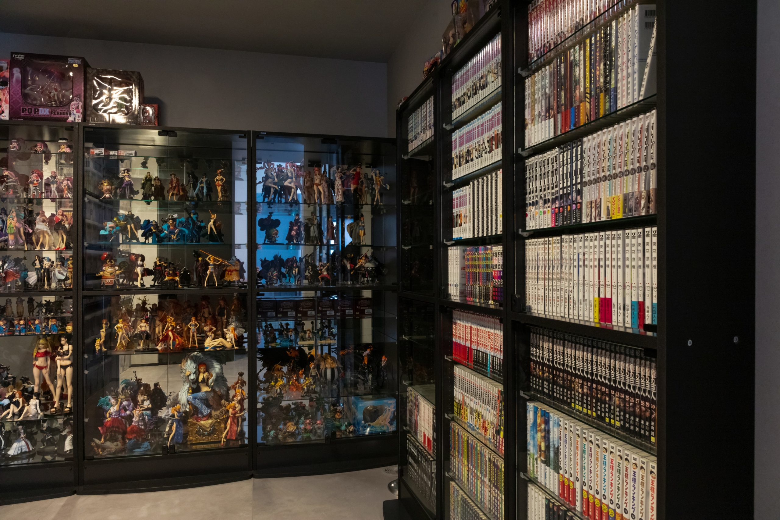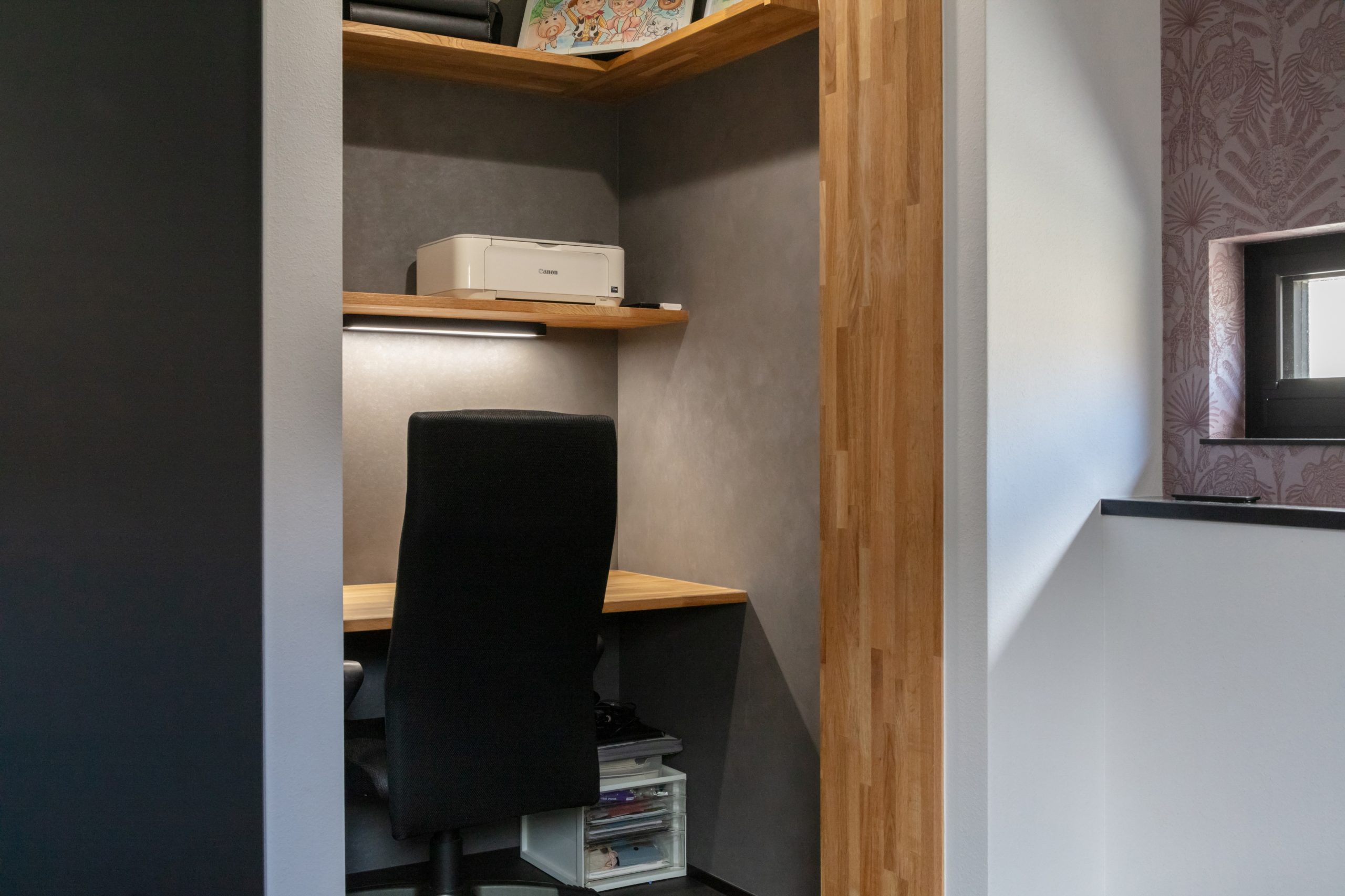 一階はキッチンと一体化した造作テーブルでホテルの朝食を思い浮かべるようなダイニング空間に。吹き抜けを抜けた2階には夫婦お二人の贅沢な趣味の空間があります。