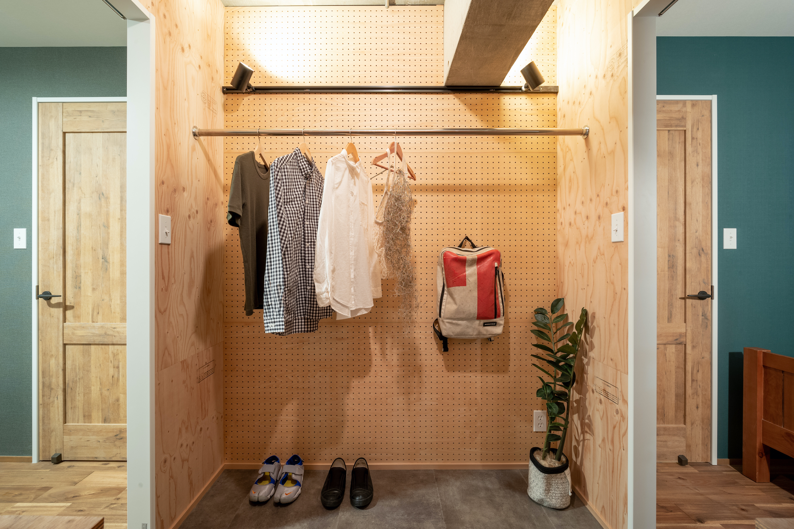 天井は躯体現しにし後から照明を変更できたり、部屋を行き来できる大きなウォークインクローゼットの壁は後から棚を追加できるような仕上げになっており創作意欲を駆り立てます。