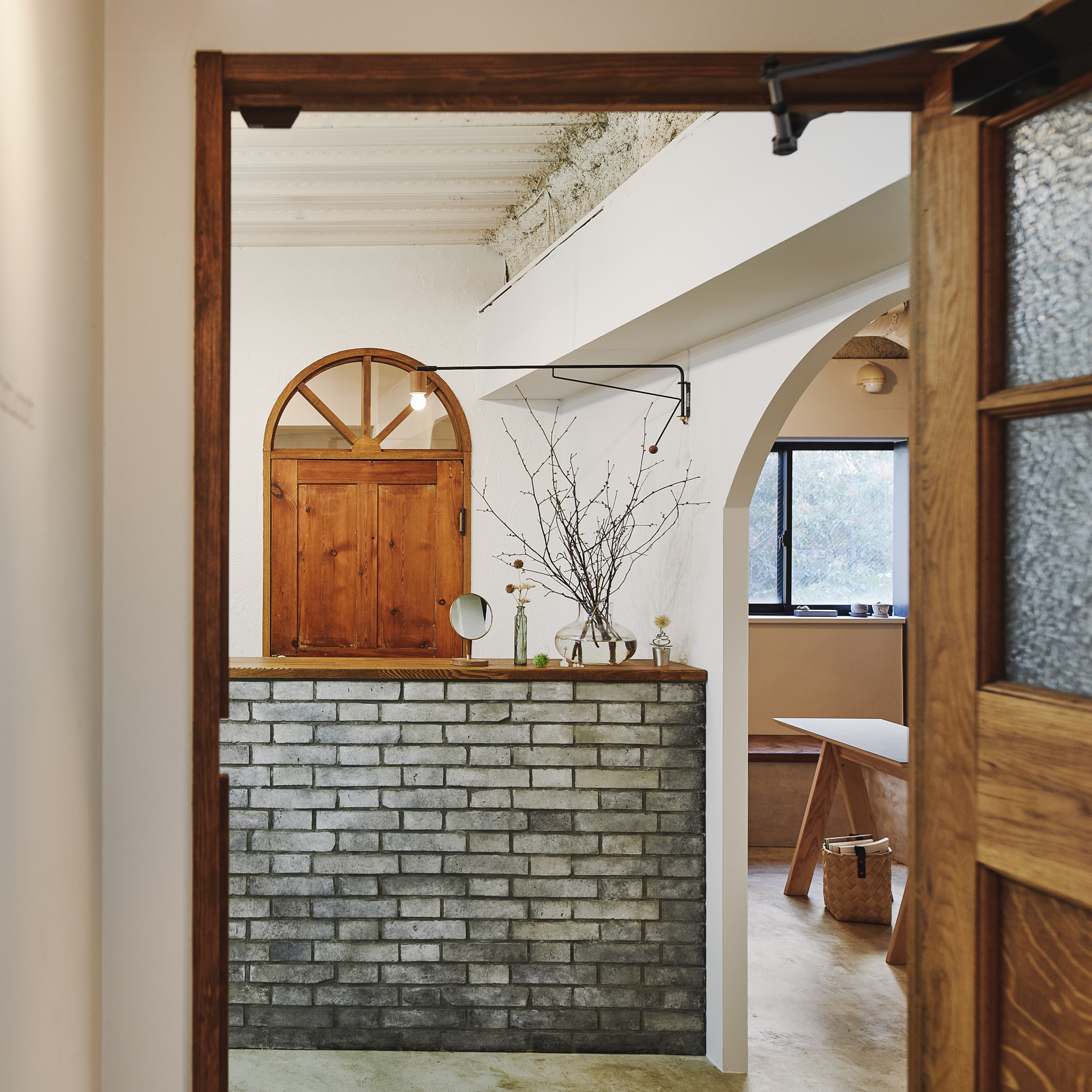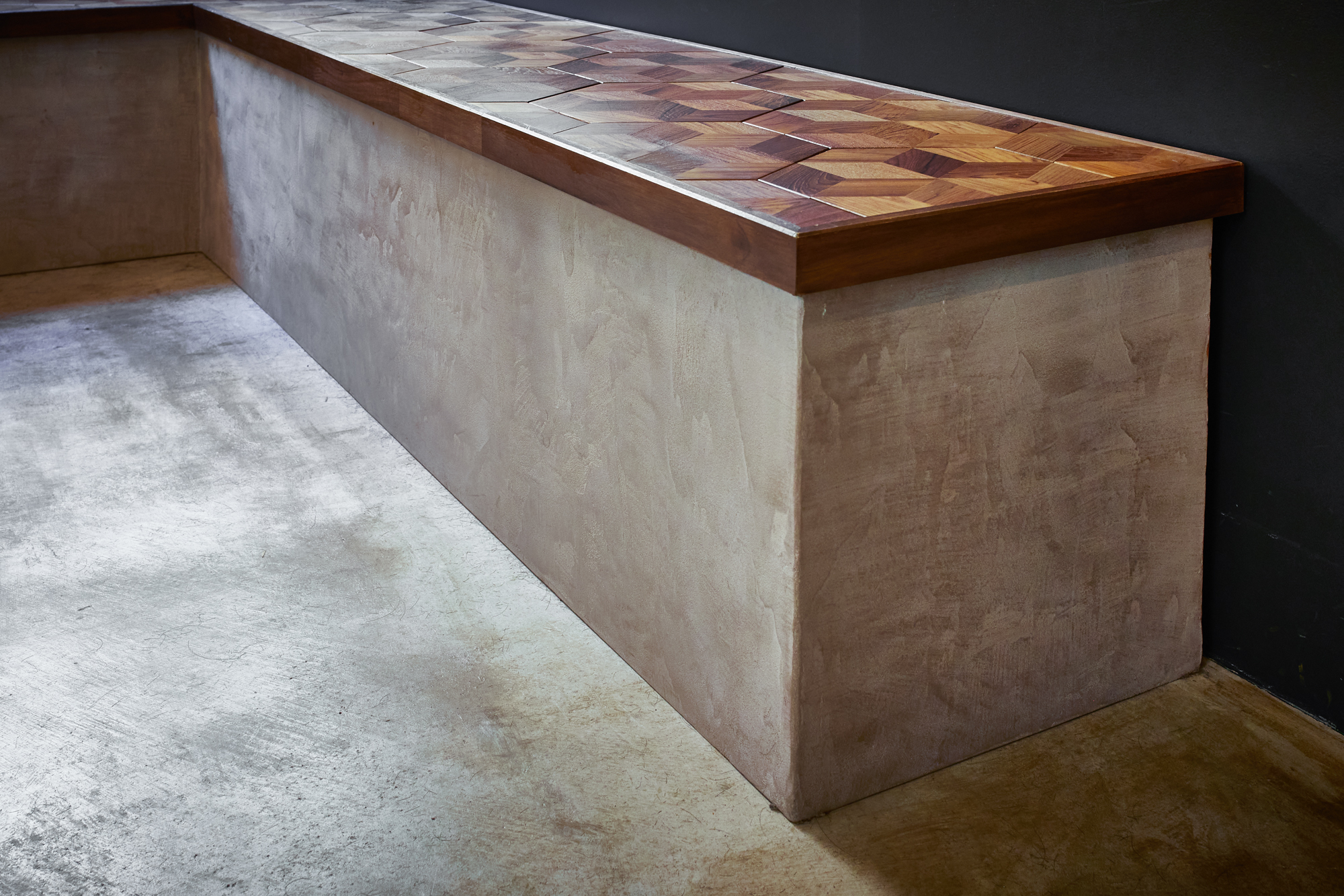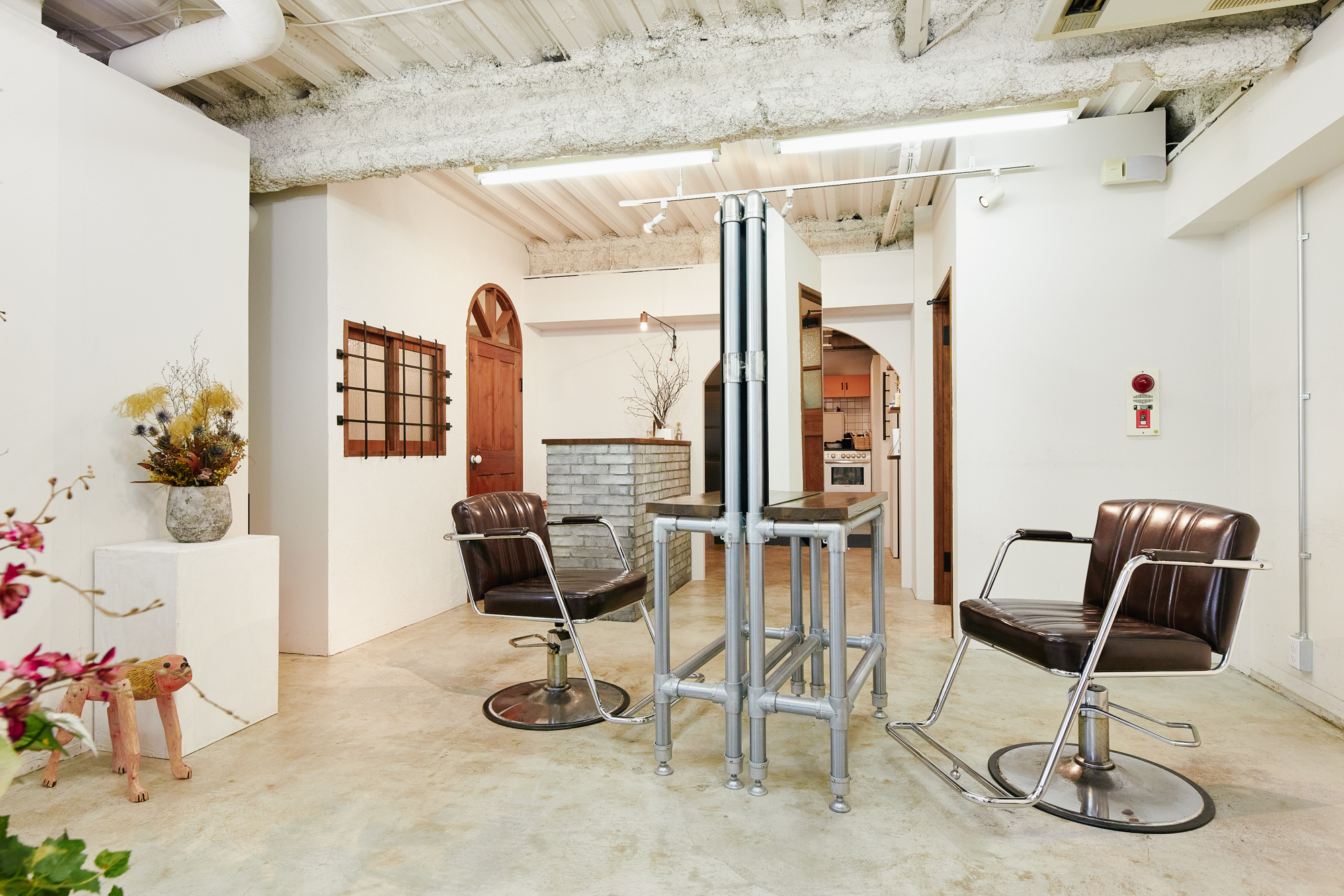 エレベーターからおり最初に目に入るファサードにはヘキサゴンのタイルとモルタルをバランス良く合わせた床とアンティークドアが重厚感を演出してくれております。レセプションカウンターはブリックタイルを正面に貼りエイジング塗装にて仕上げました。背面のバックヤードのドアもアンティークのドア上部にはアーチの飾り窓を組み合わせております。小窓についた黒皮鉄の格子もアクセントになっております。アーチで造作した壁を抜けると待合室になります。待合室のベンチは座面を六角形が組み合わさった『パーケット』のフロア材を使用し、立ち上がりは『モールテックス』にて仕上げました。ストックロームの入り口にはアイアンのハンギング金物のドアを取り付けました。
