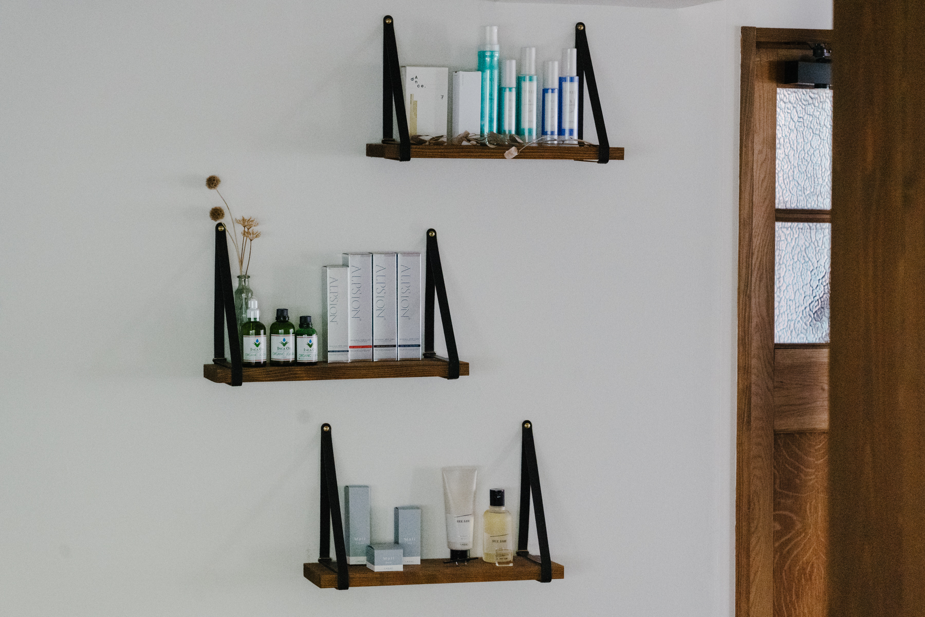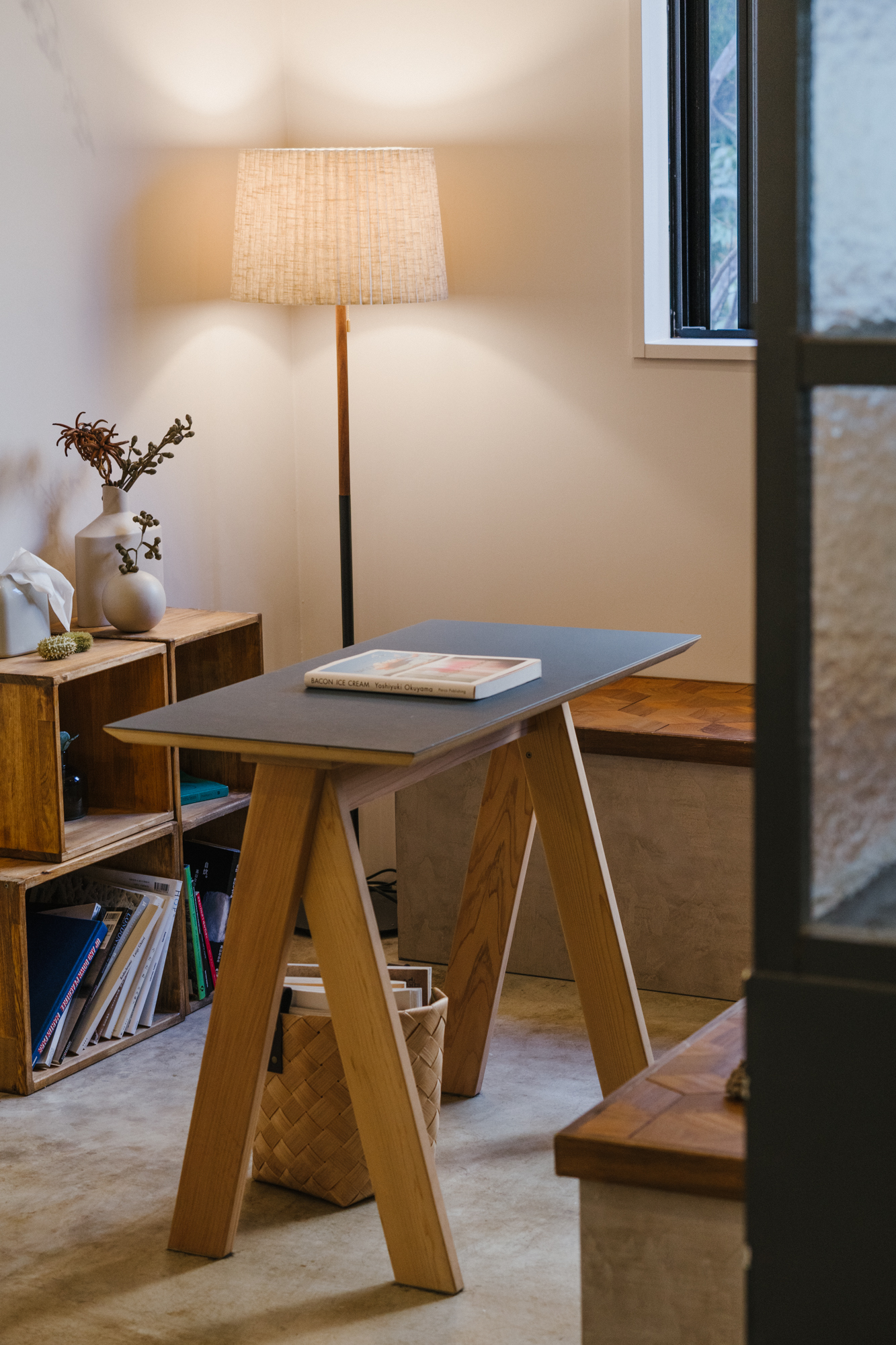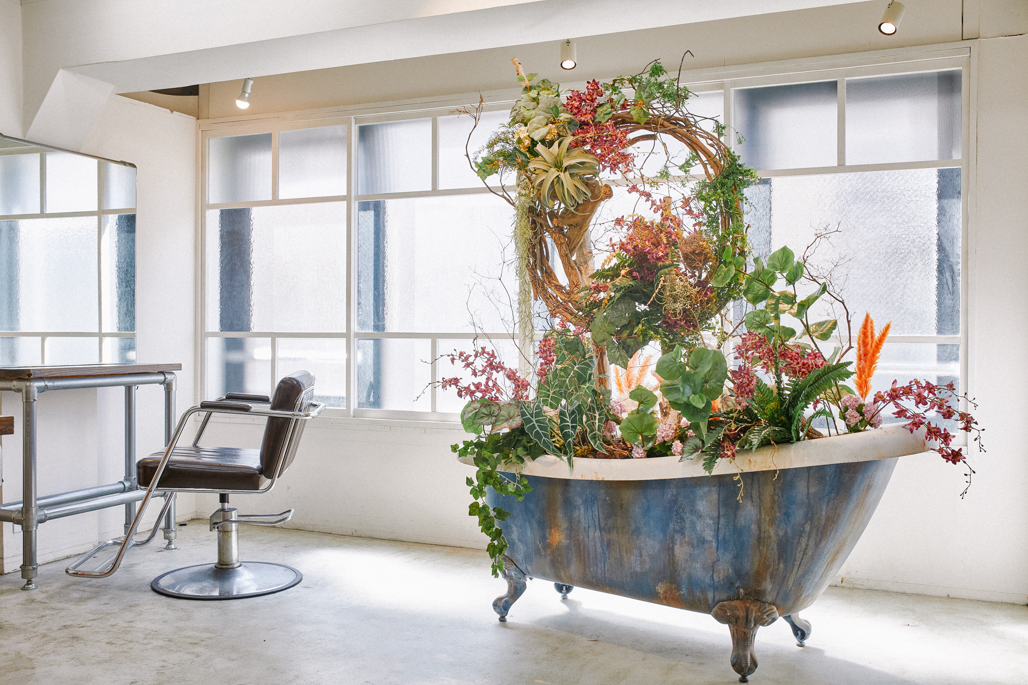 エレベーターからおり最初に目に入るファサードにはヘキサゴンのタイルとモルタルをバランス良く合わせた床とアンティークドアが重厚感を演出してくれております。レセプションカウンターはブリックタイルを正面に貼りエイジング塗装にて仕上げました。背面のバックヤードのドアもアンティークのドア上部にはアーチの飾り窓を組み合わせております。小窓についた黒皮鉄の格子もアクセントになっております。アーチで造作した壁を抜けると待合室になります。待合室のベンチは座面を六角形が組み合わさった『パーケット』のフロア材を使用し、立ち上がりは『モールテックス』にて仕上げました。ストックロームの入り口にはアイアンのハンギング金物のドアを取り付けました。