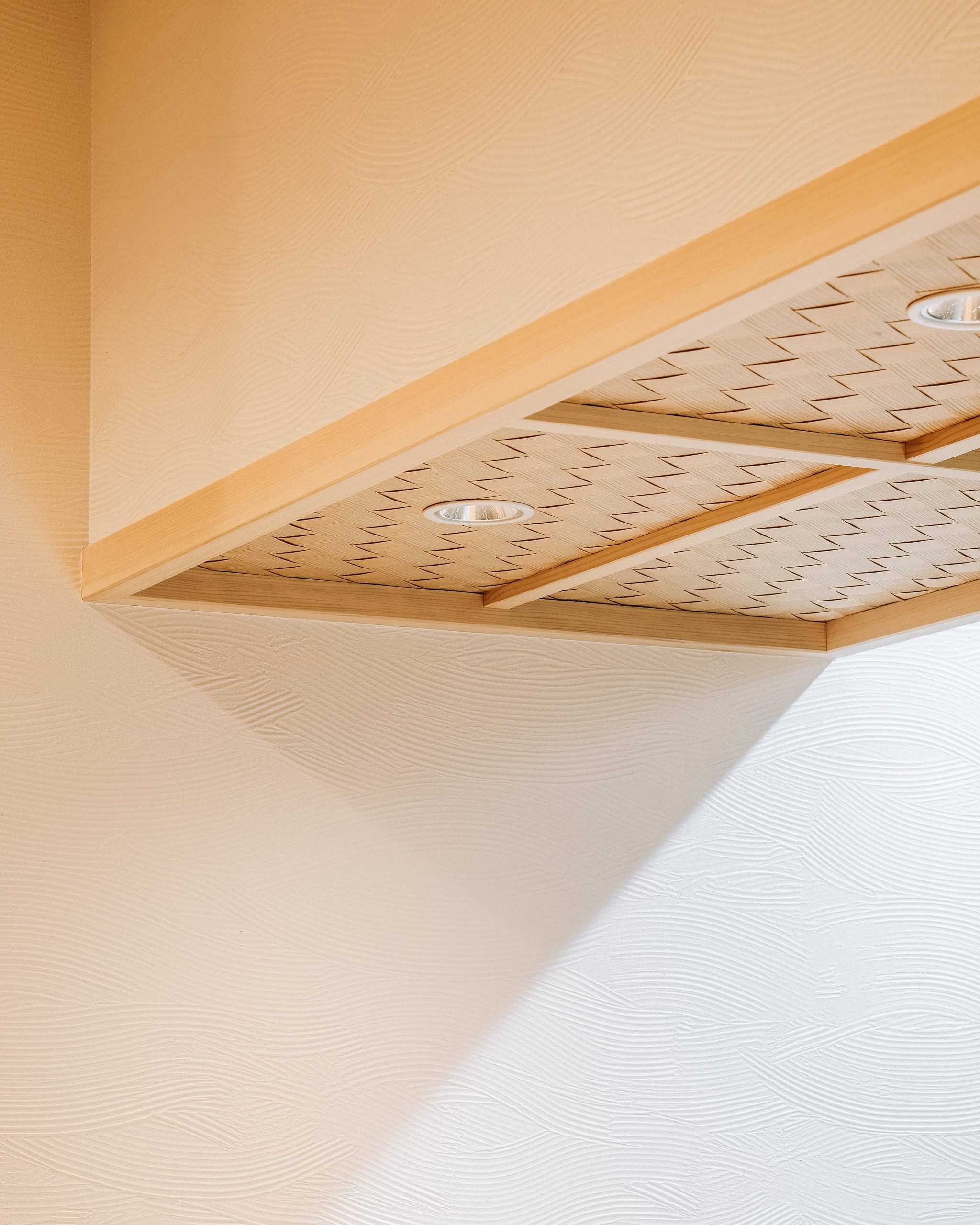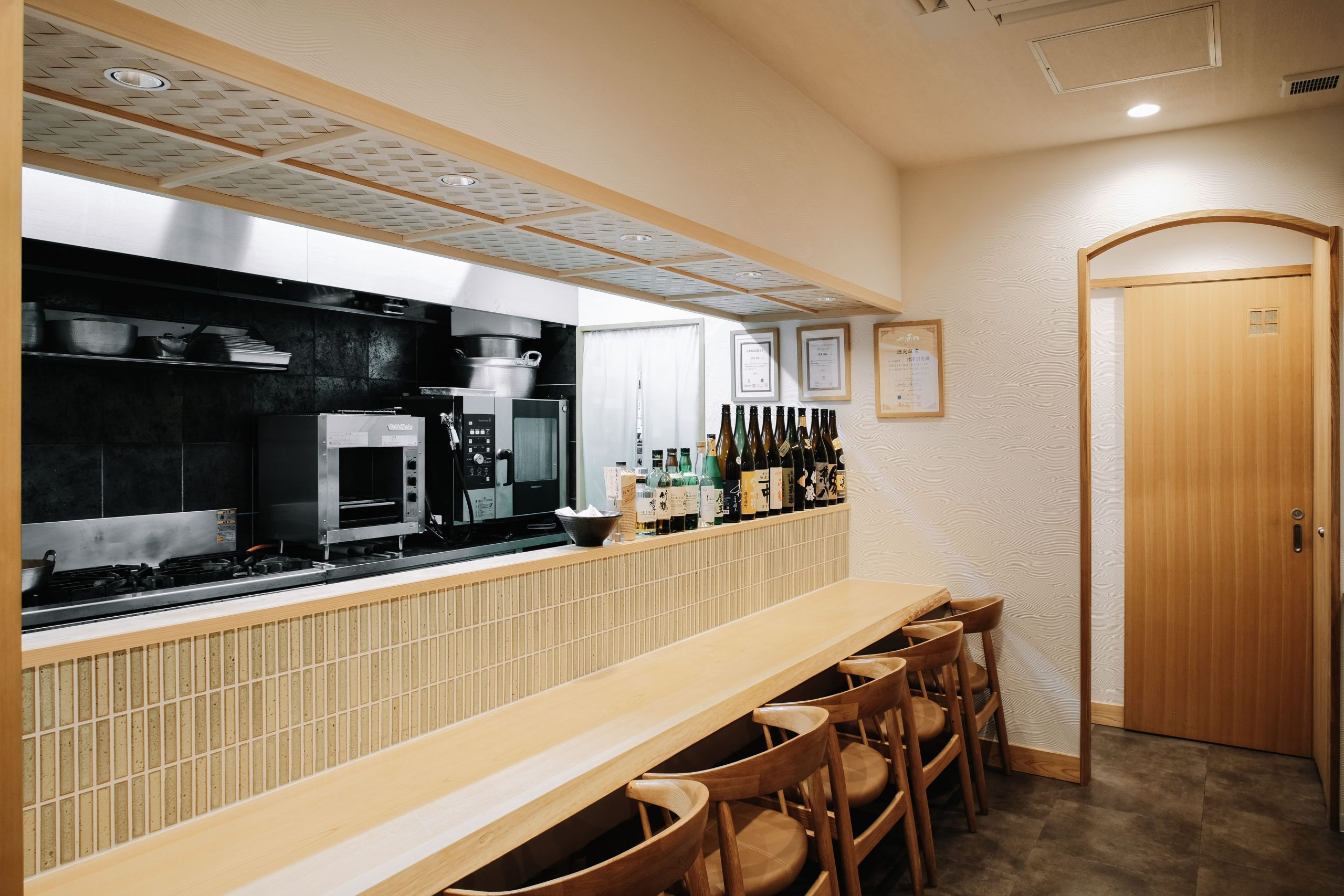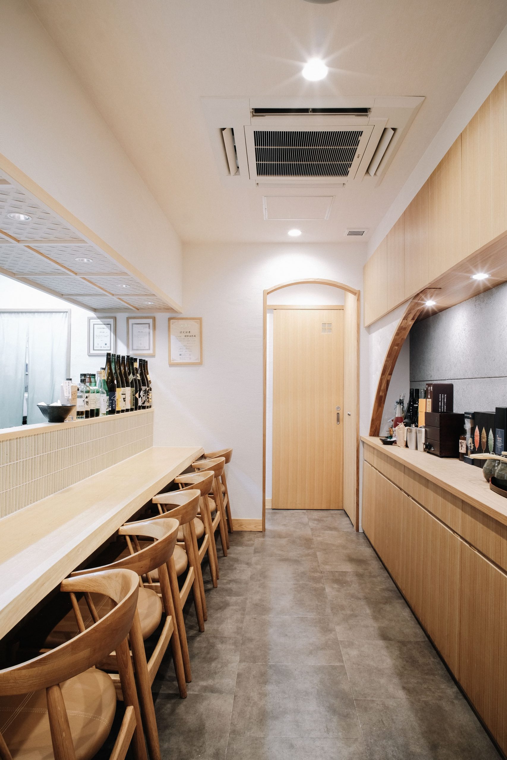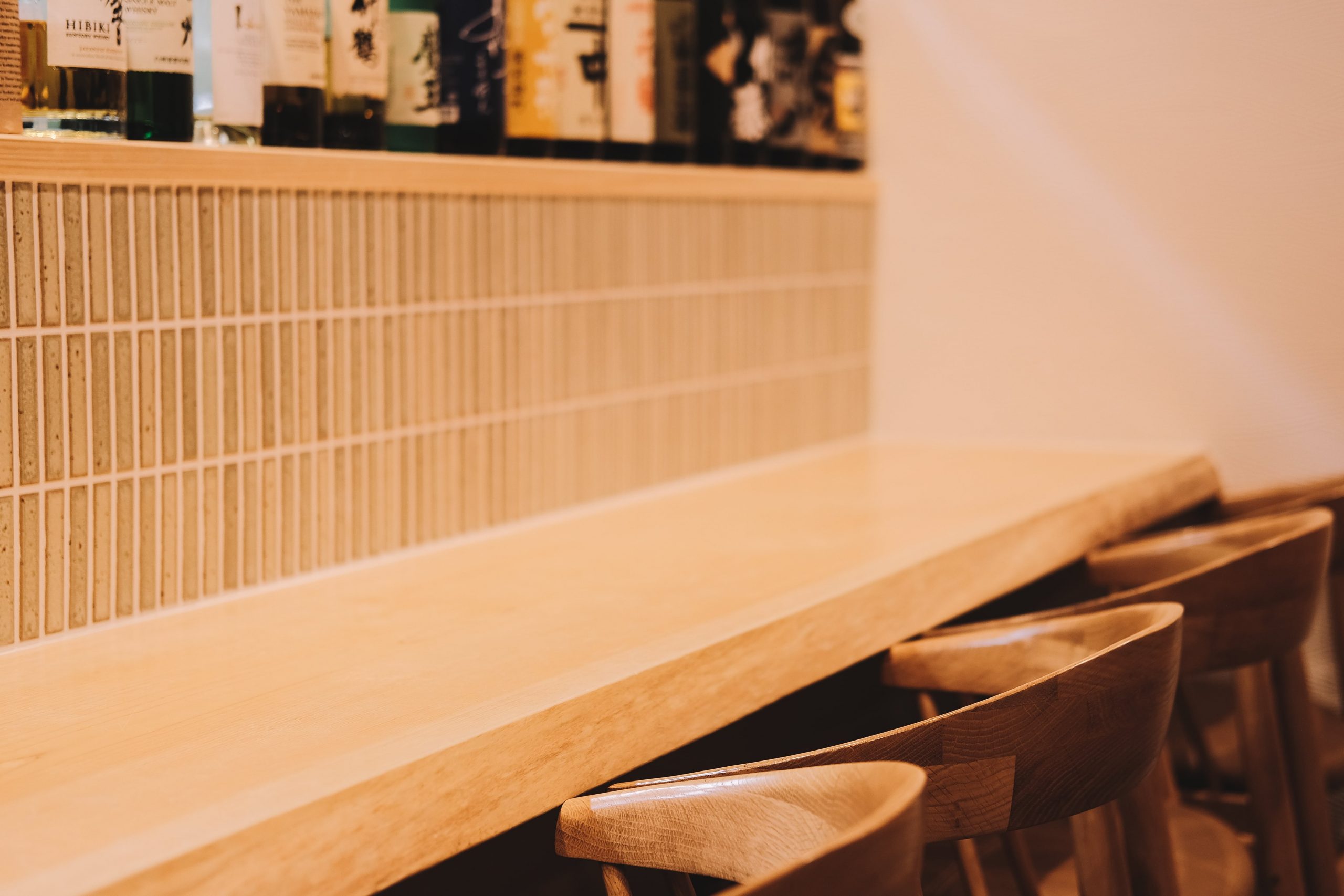 オーナ様と共に目指したのは伝統的”和職”の技術の中にも遊び心を。ヒノキの天然木と漆喰を使用した奥行きのあるエントランスから店内に入ると、天然木をふんだんに使った温かみのある空間がもてなしてくれます。伝統工芸の”組子細工の欄間”からこぼれる灯りがお料理とお酒の演出してくれています