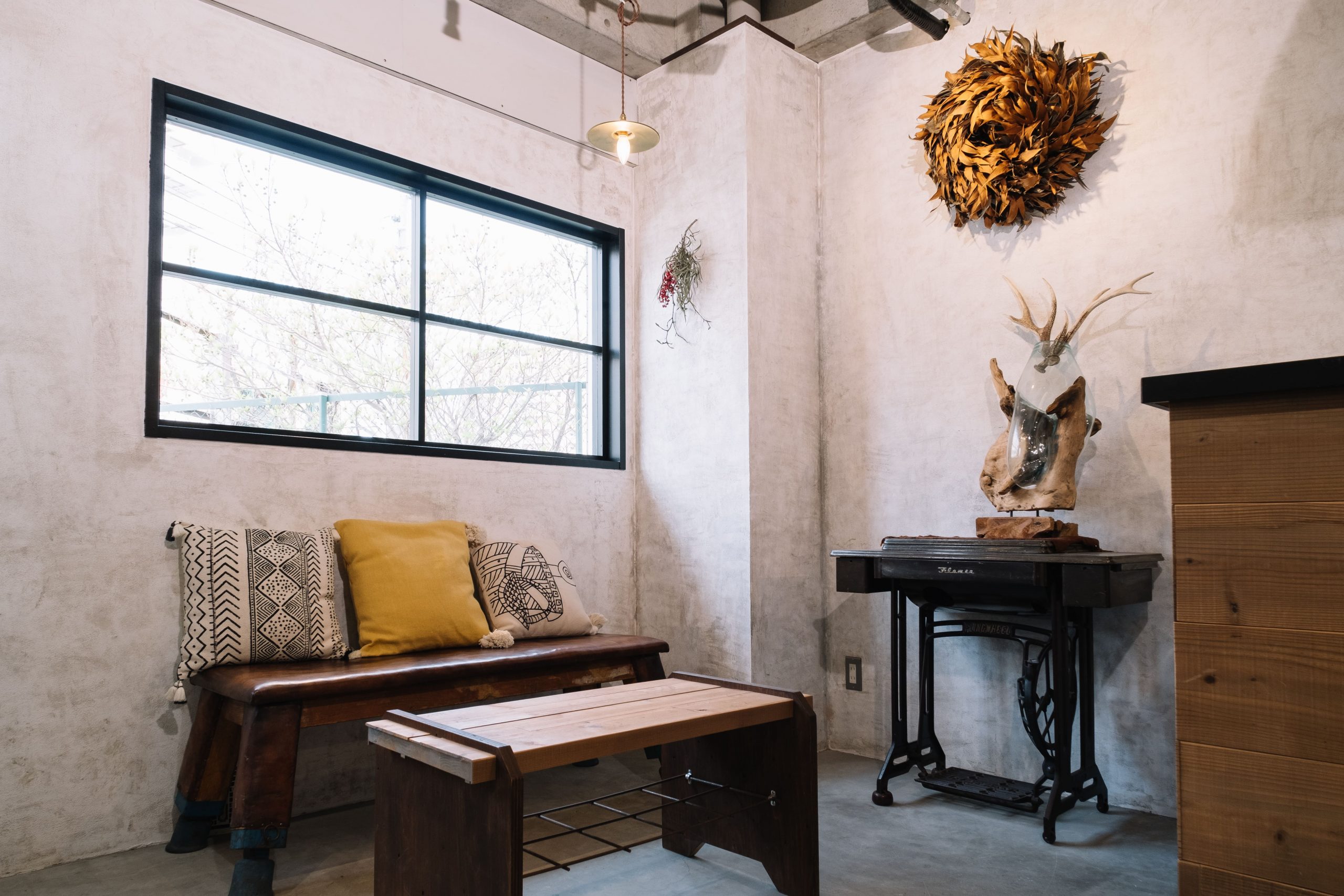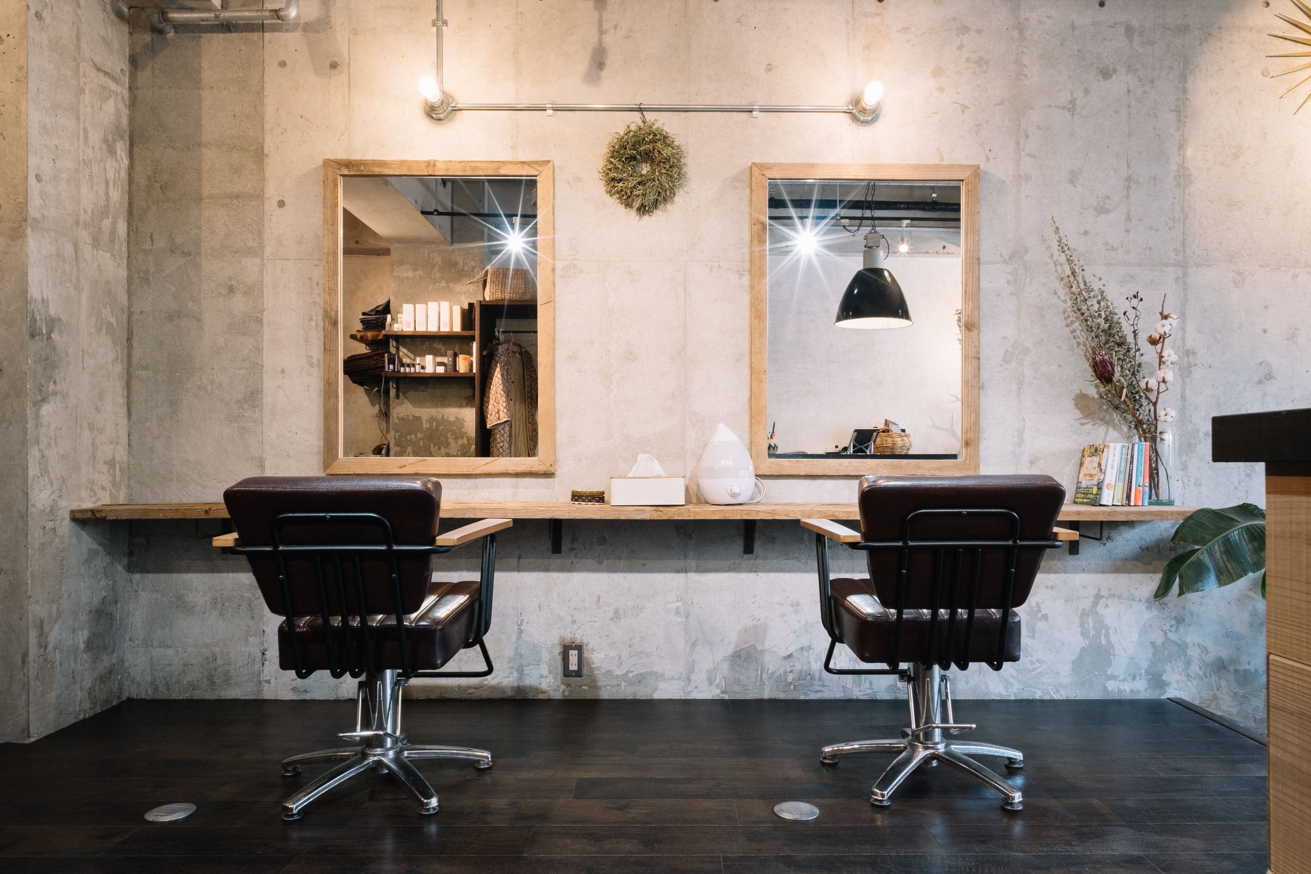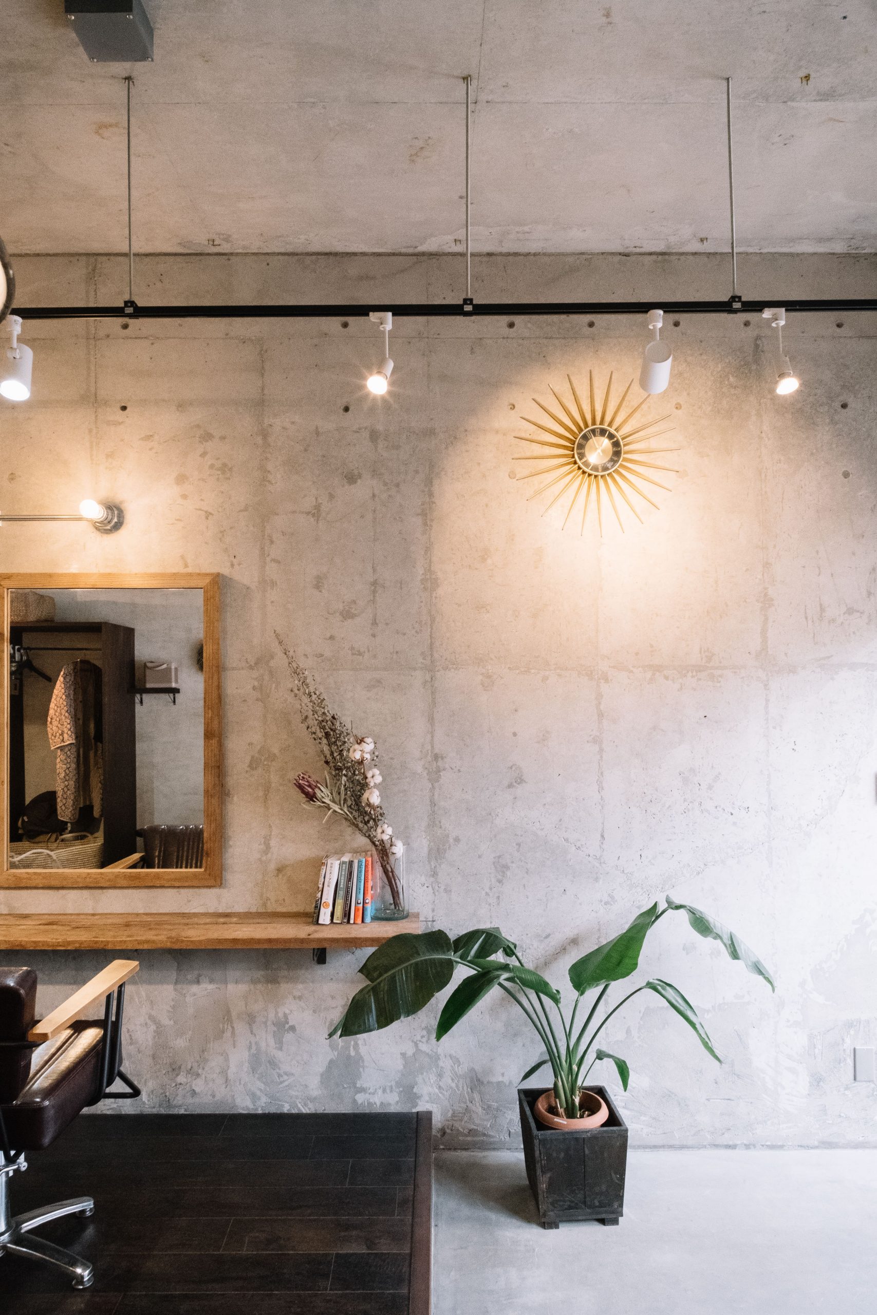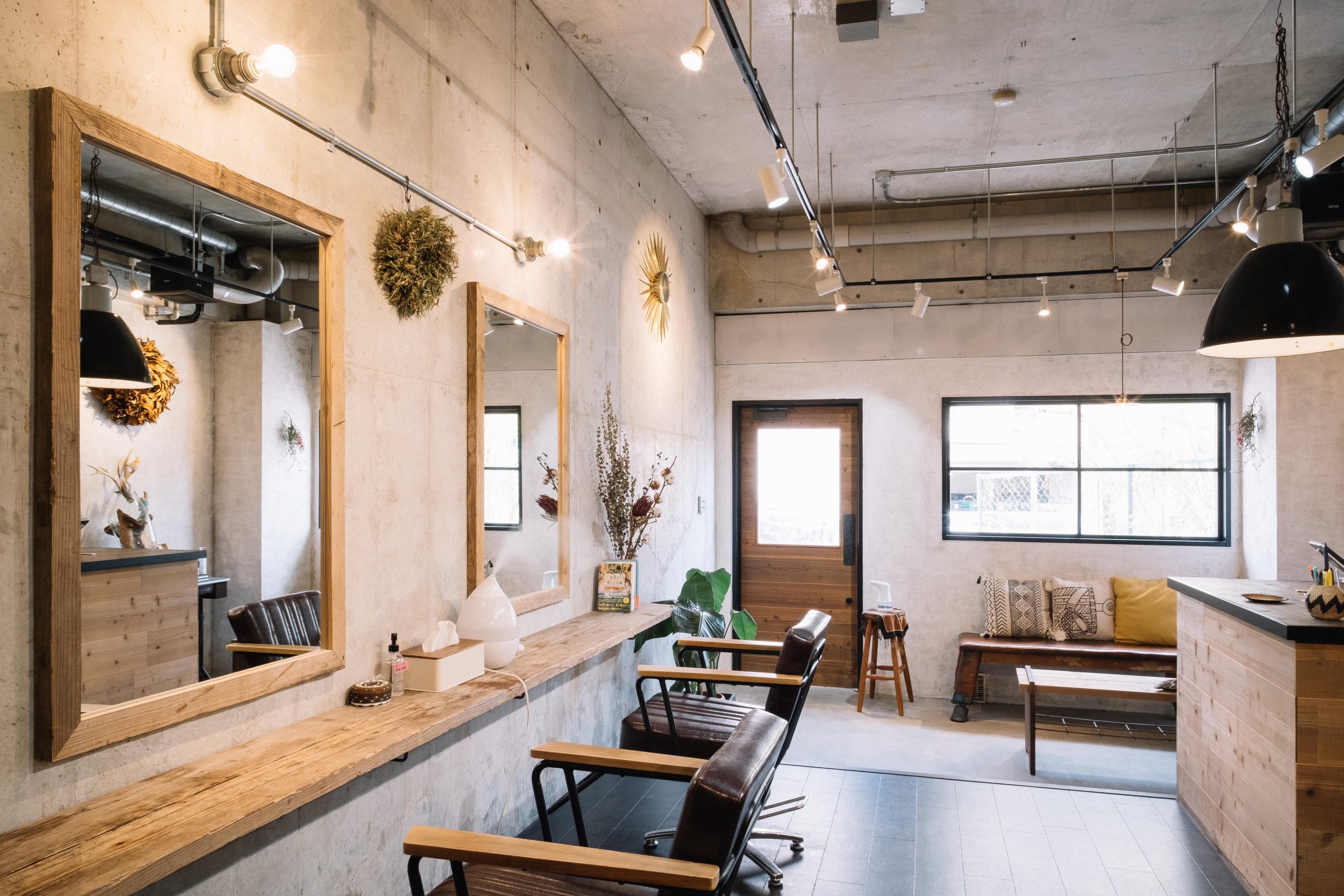 建物の内部の素地をそのままデザインに取り入れたインダストリアルな空間のヘアーサロンです。コンクリートを活かしたアイテムはデザインは女性オーナー様のこだわり。どこかあたたかでホットするサロンです。