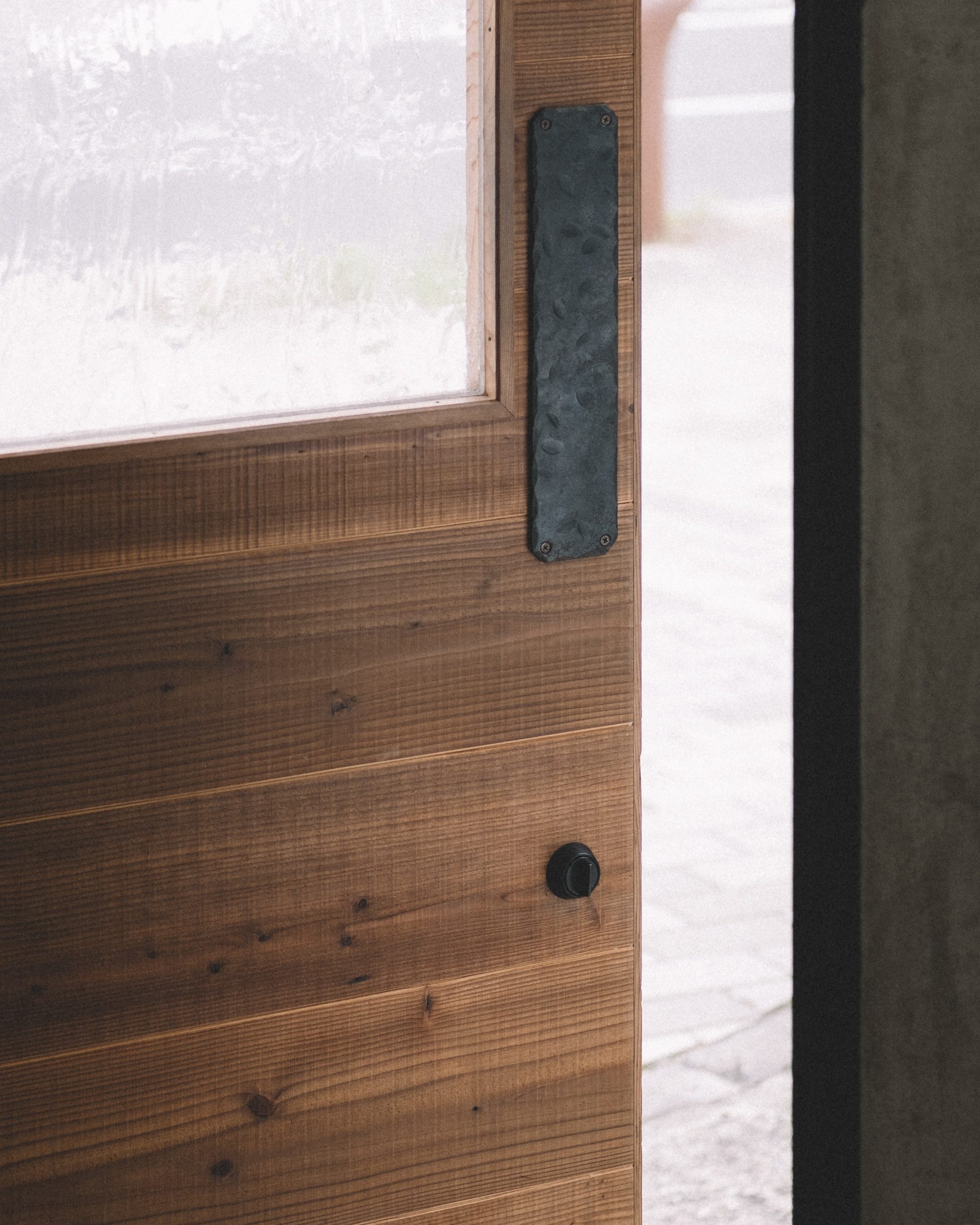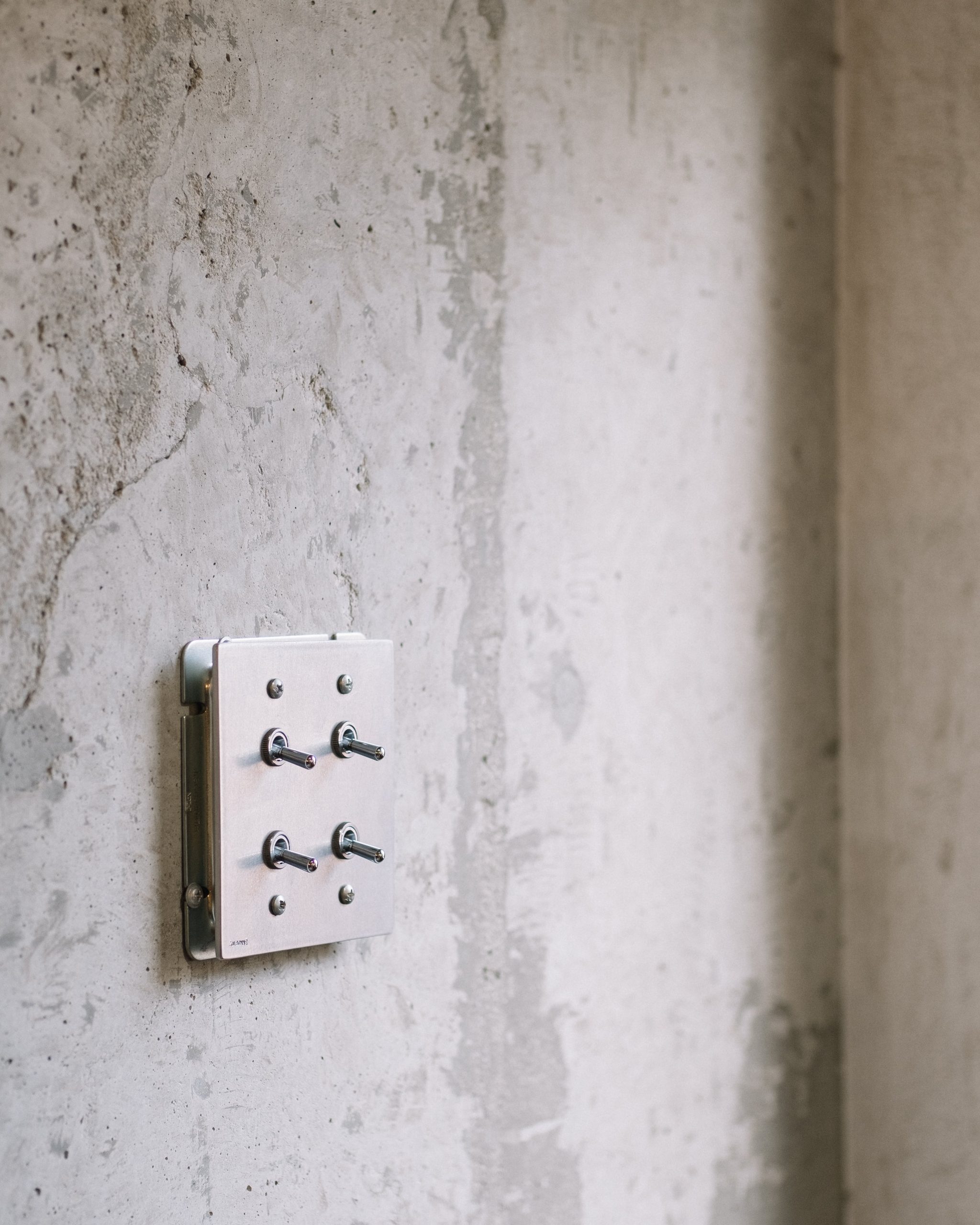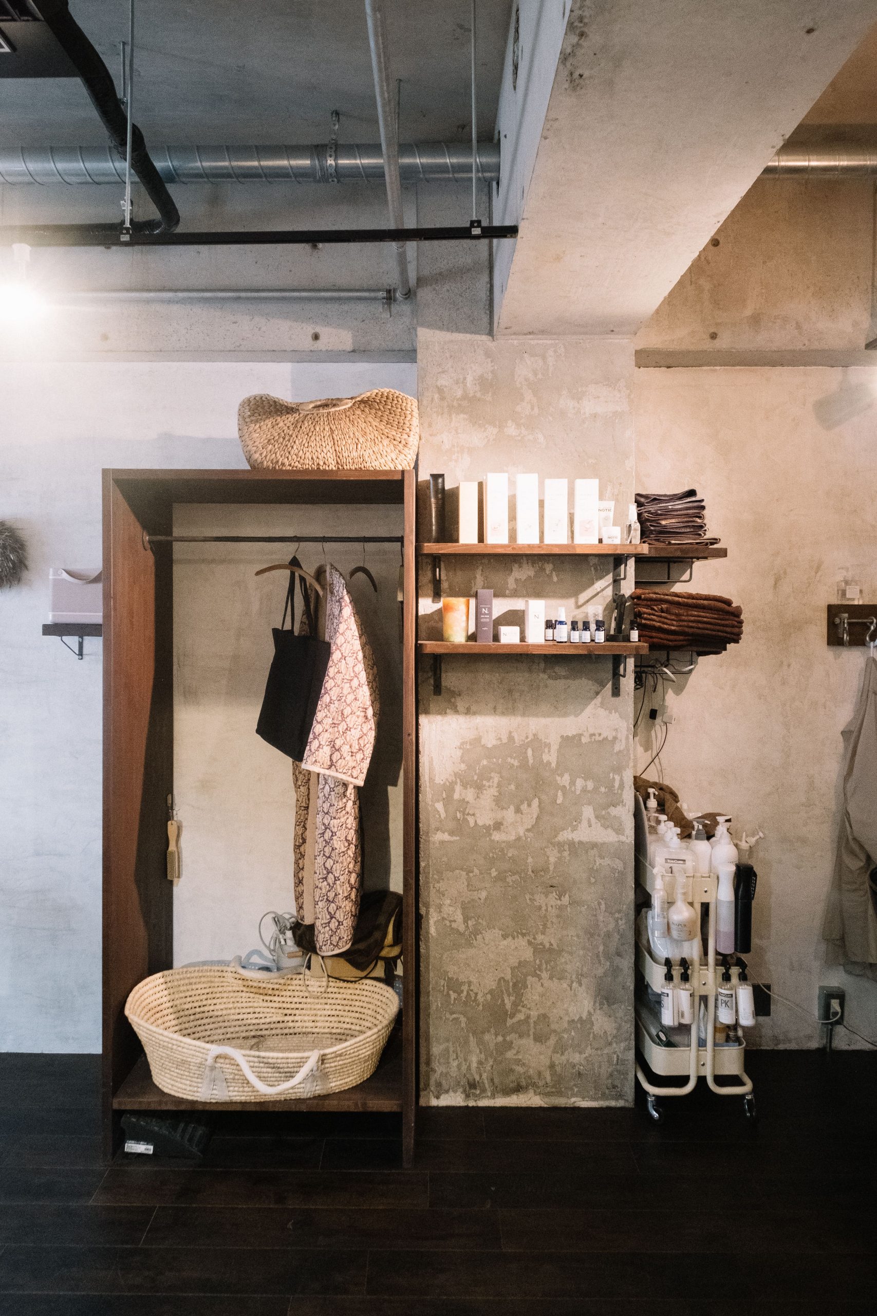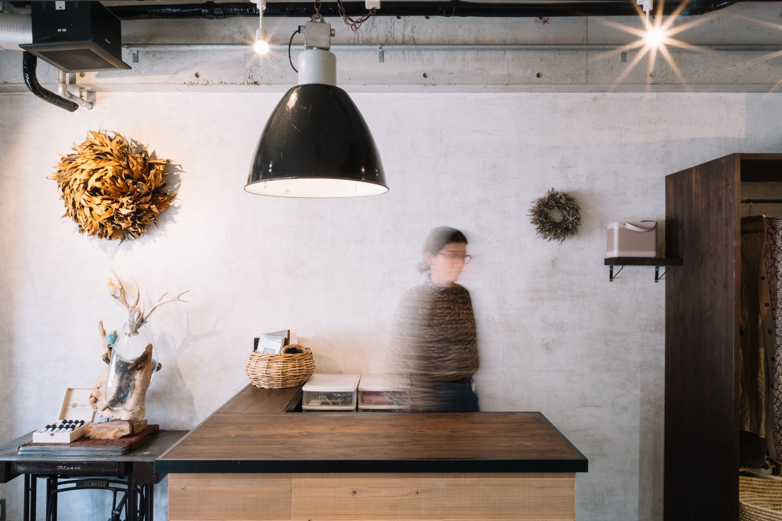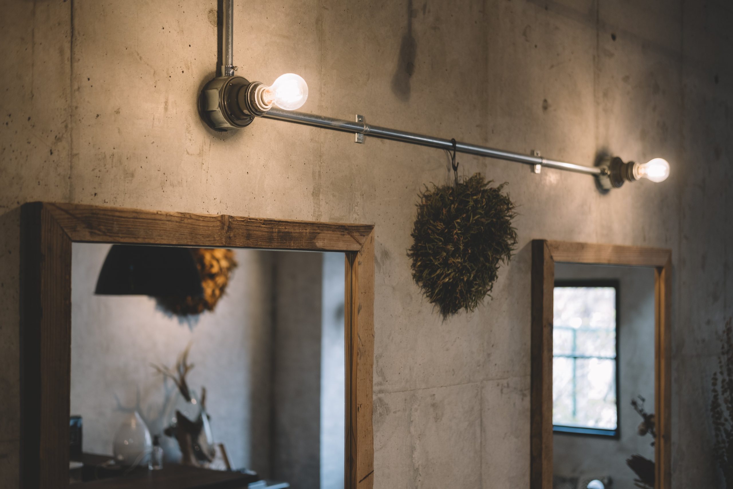 建物の内部の素地をそのままデザインに取り入れたインダストリアルな空間のヘアーサロンです。コンクリートを活かしたアイテムはデザインは女性オーナー様のこだわり。どこかあたたかでホットするサロンです。