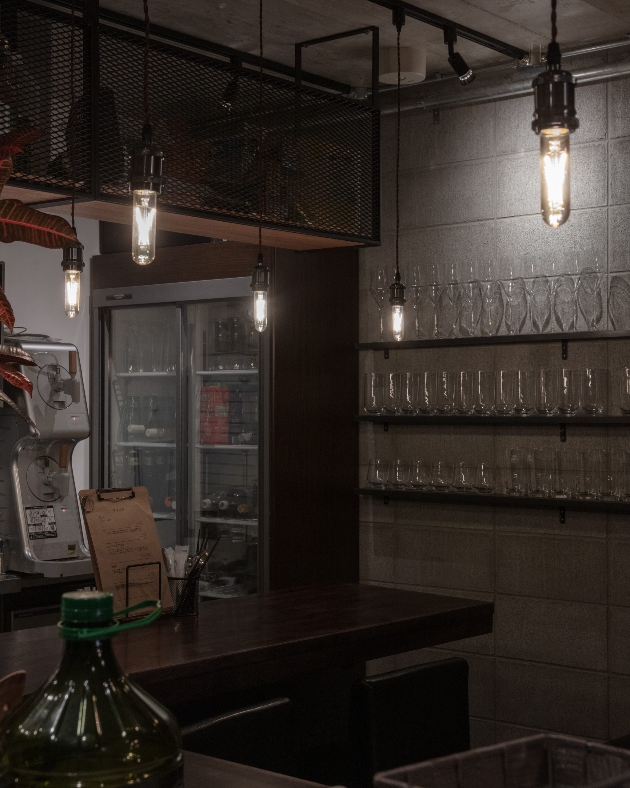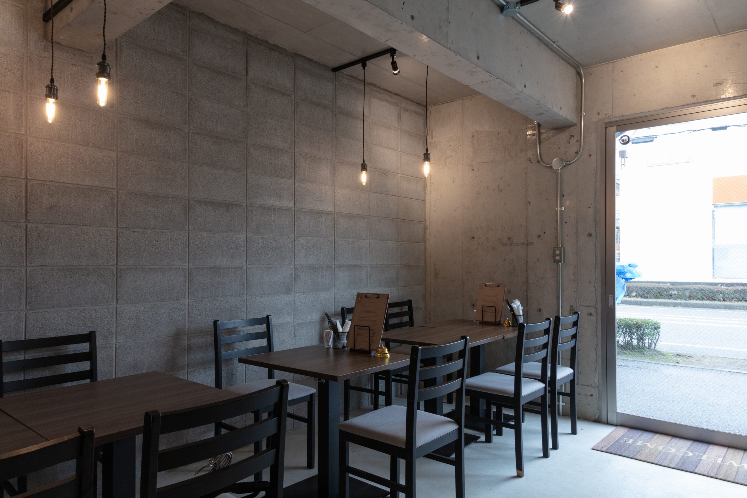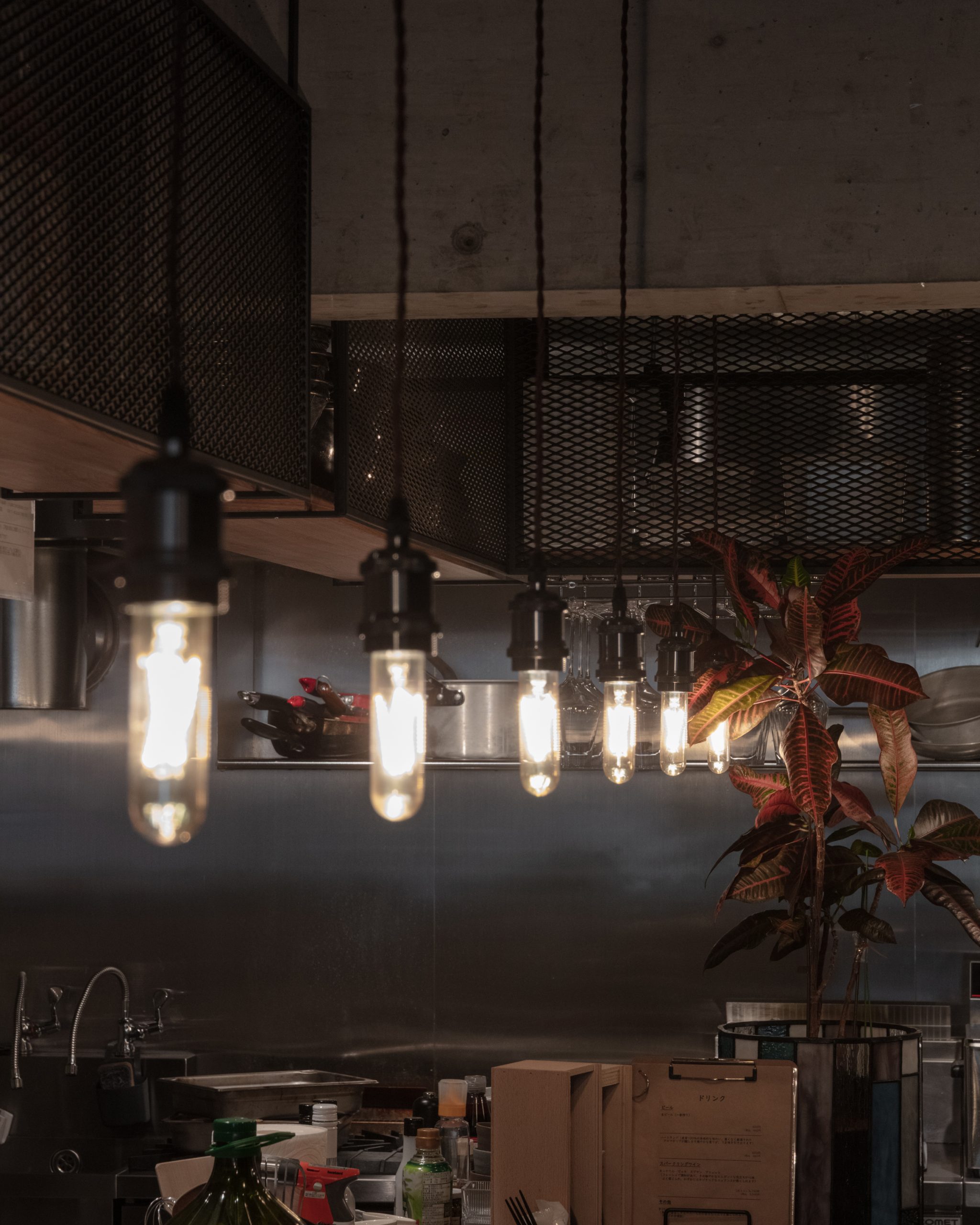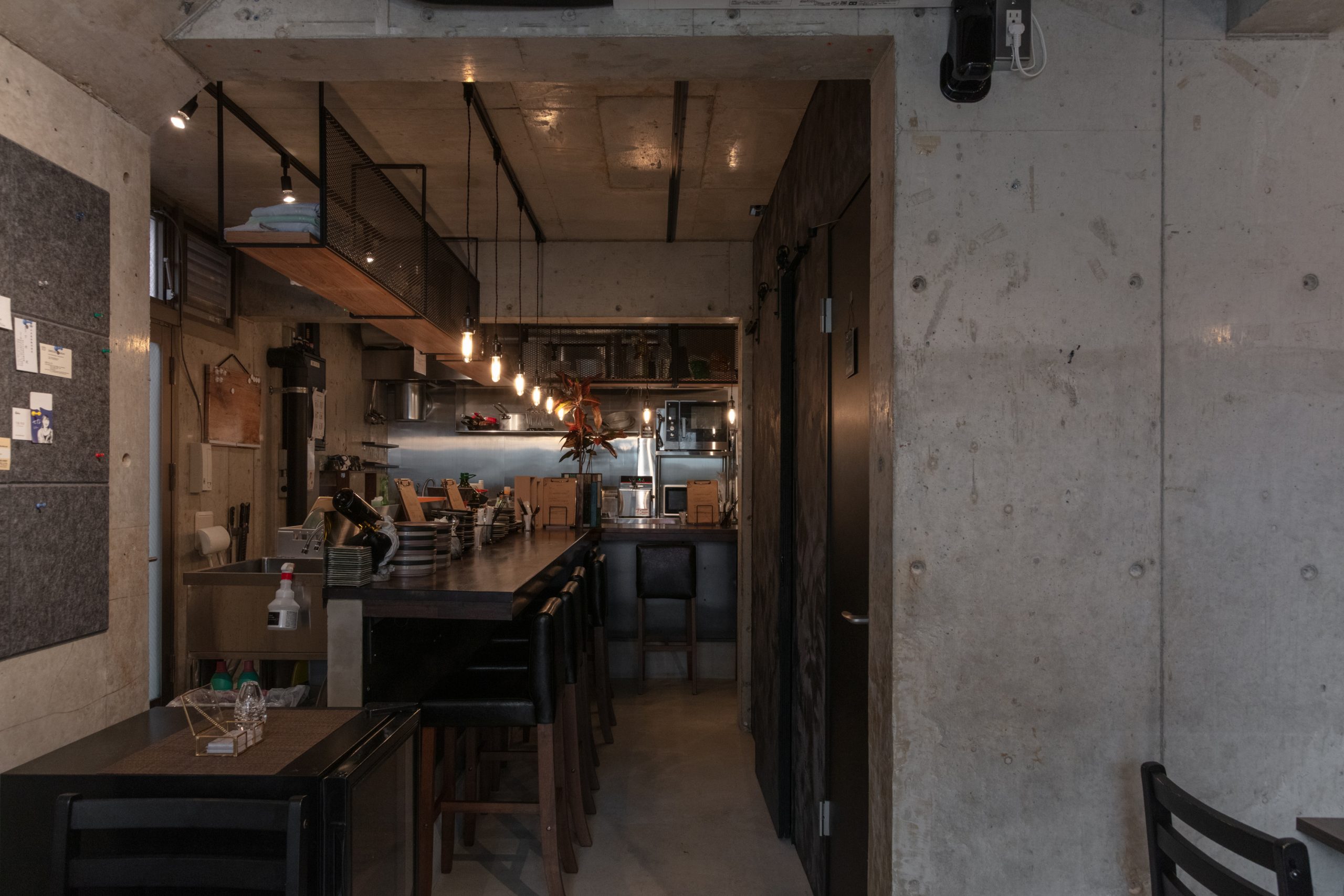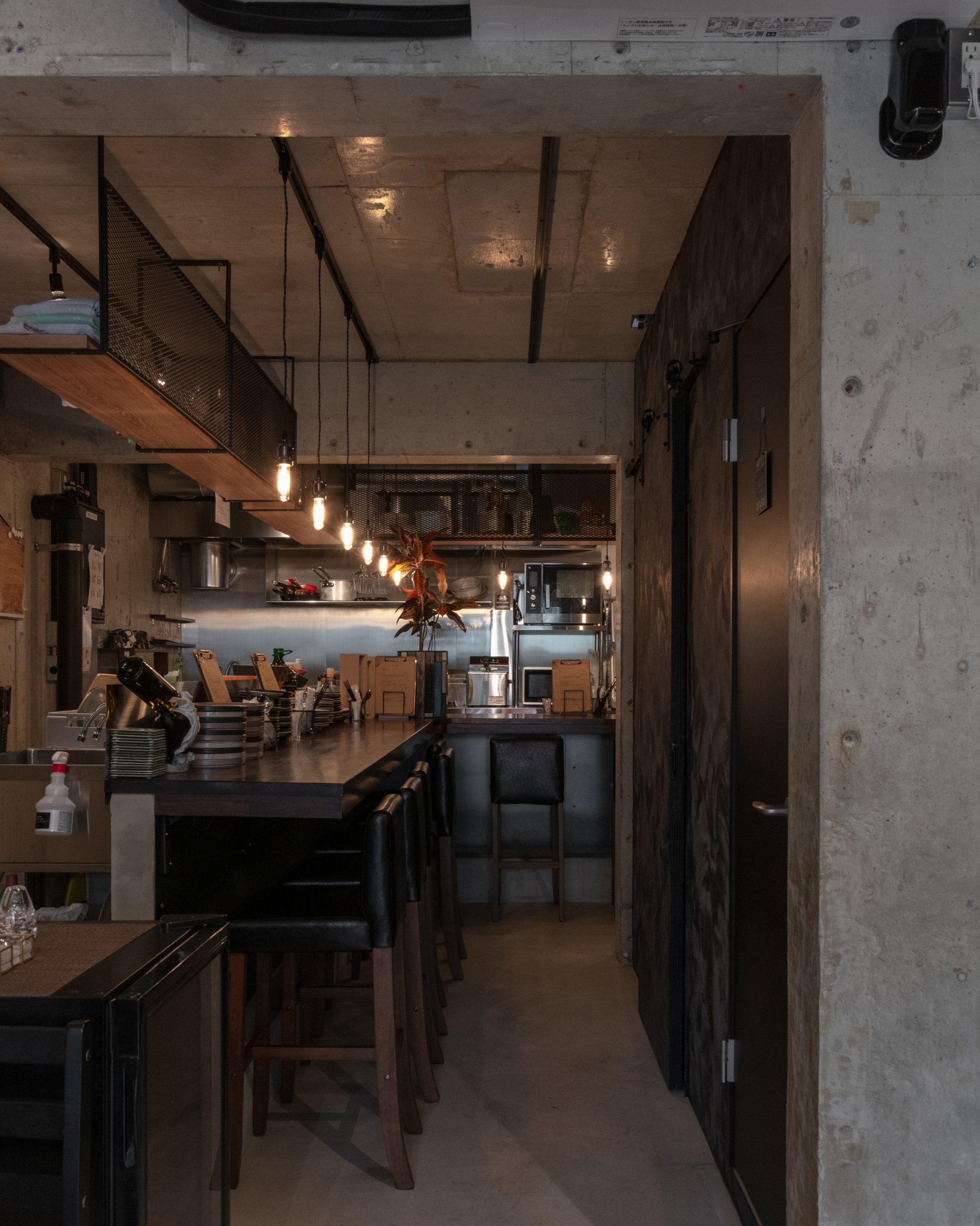 コンクリートむき出しの素材とアイアンの組み合わせが、モダンで洗練された空間を作り出しています。オープンキッチンスタイルのL型のカウンターからは厨房内が見渡せ、料理が作られる様子を楽しむことができます。カウンター席とは別にグループでのお食事が楽しめるテーブル席も配置できました。アクセントになるマットな黒い壁は、インダストリアルな雰囲気を強調しています。店内カウンターにはアラジンランプが配置され、温かみのある光がインダストリアルな空間に柔らかさを加えています。洗練されたデザインと心地よい雰囲気の中で、フレンチ料理をカジュアルに楽しむことができる特別な場所です。ぜひ一度足を運んでみてください。