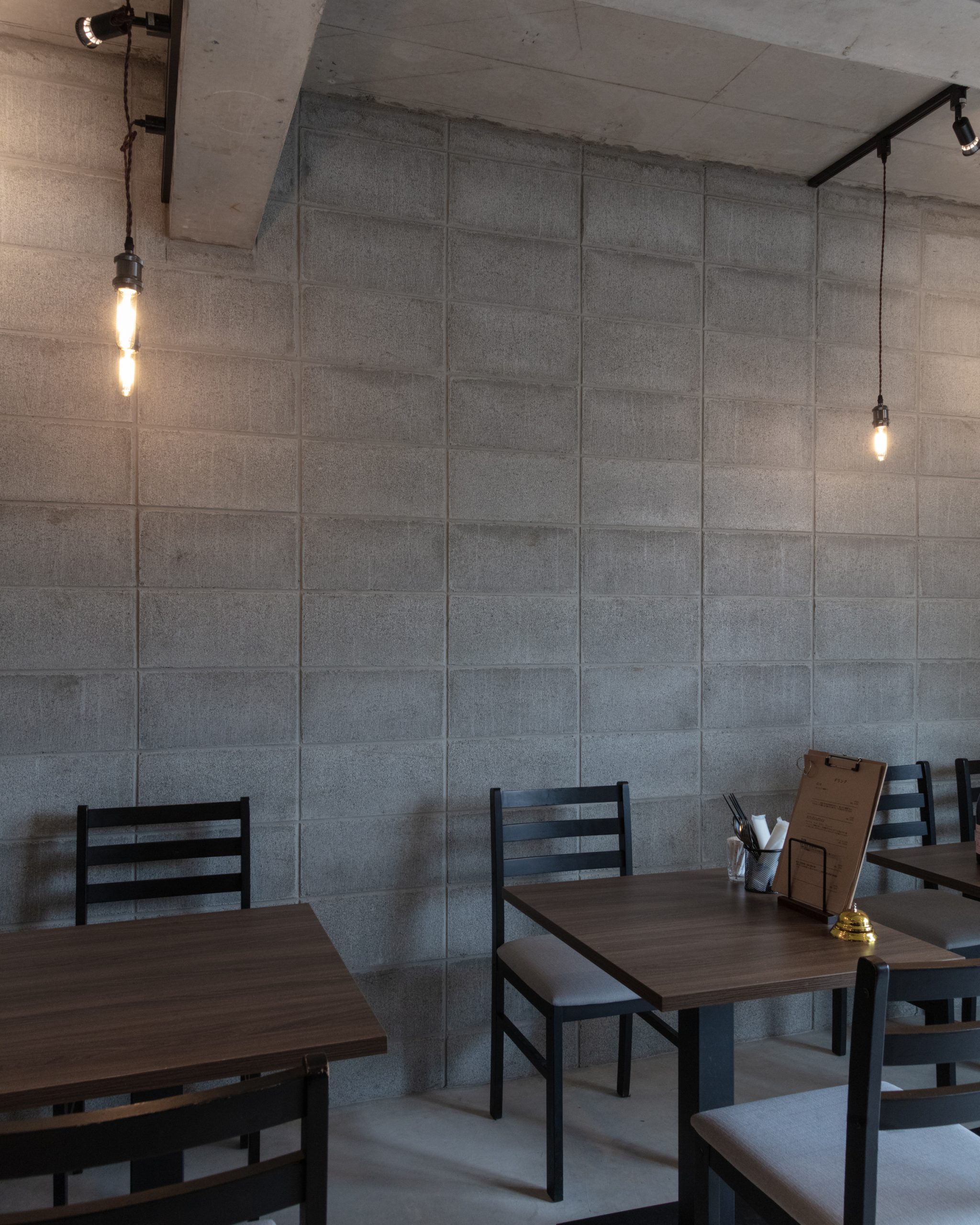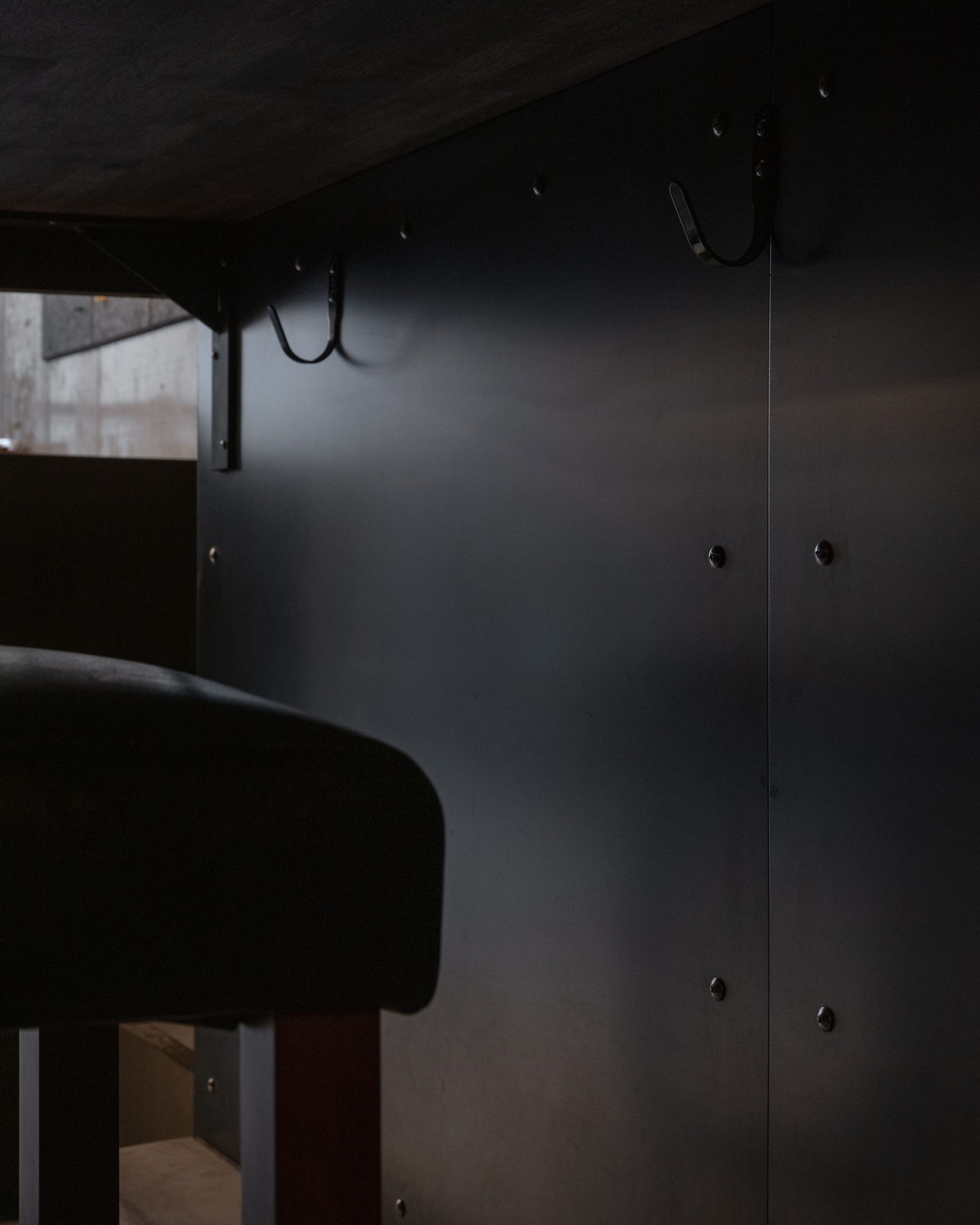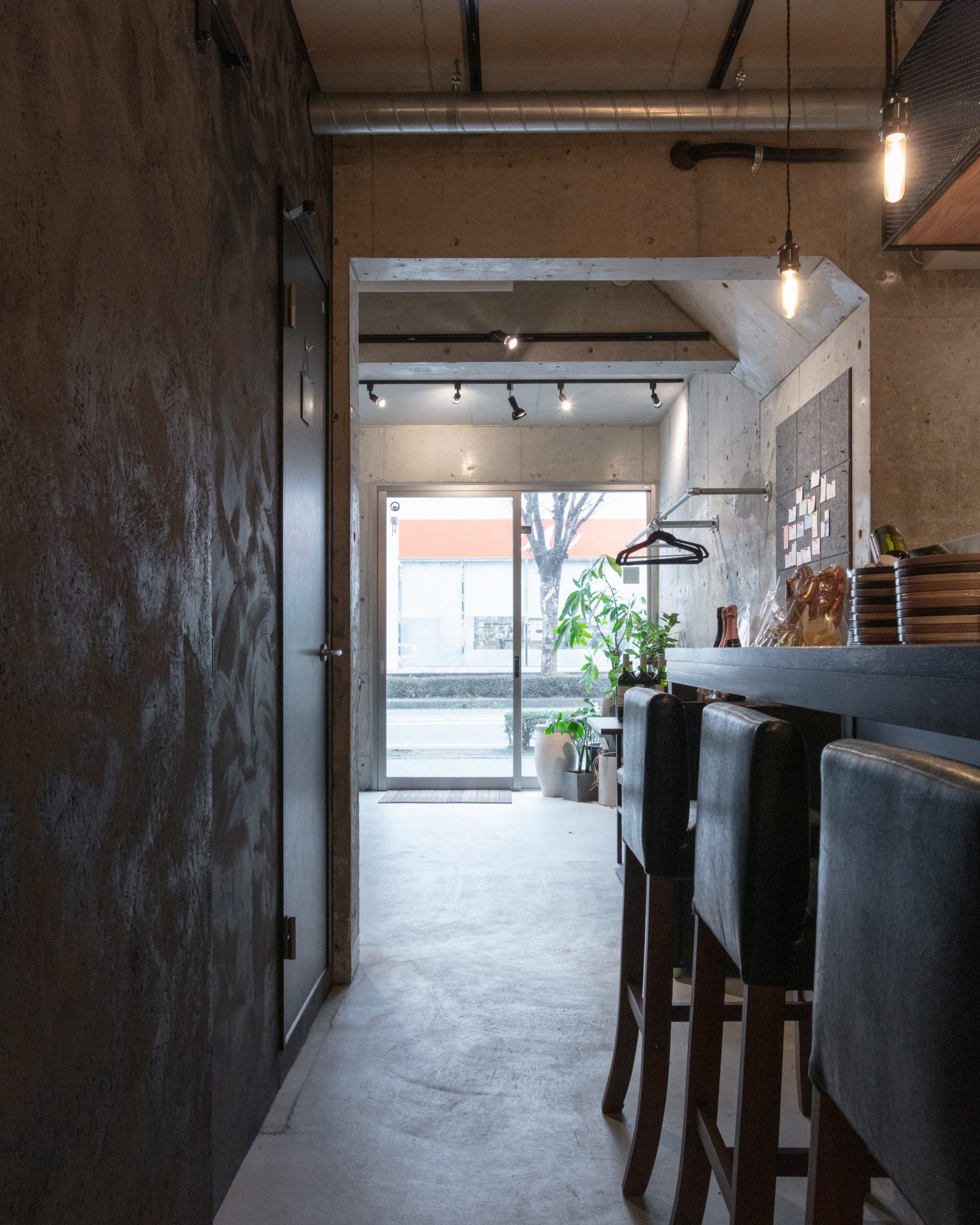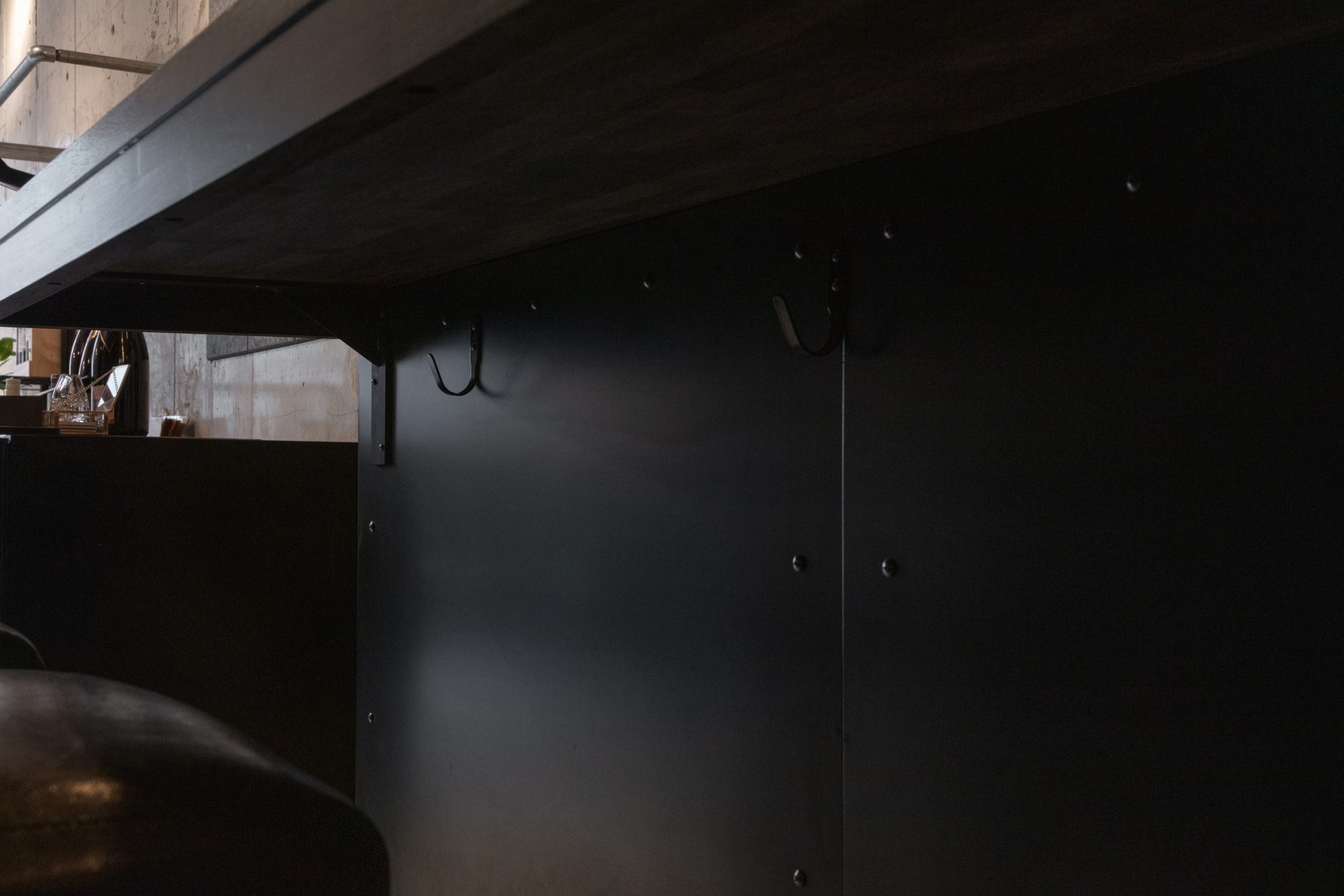 コンクリートむき出しの素材とアイアンの組み合わせが、モダンで洗練された空間を作り出しています。オープンキッチンスタイルのL型のカウンターからは厨房内が見渡せ、料理が作られる様子を楽しむことができます。カウンター席とは別にグループでのお食事が楽しめるテーブル席も配置できました。アクセントになるマットな黒い壁は、インダストリアルな雰囲気を強調しています。店内カウンターにはアラジンランプが配置され、温かみのある光がインダストリアルな空間に柔らかさを加えています。洗練されたデザインと心地よい雰囲気の中で、フレンチ料理をカジュアルに楽しむことができる特別な場所です。ぜひ一度足を運んでみてください。