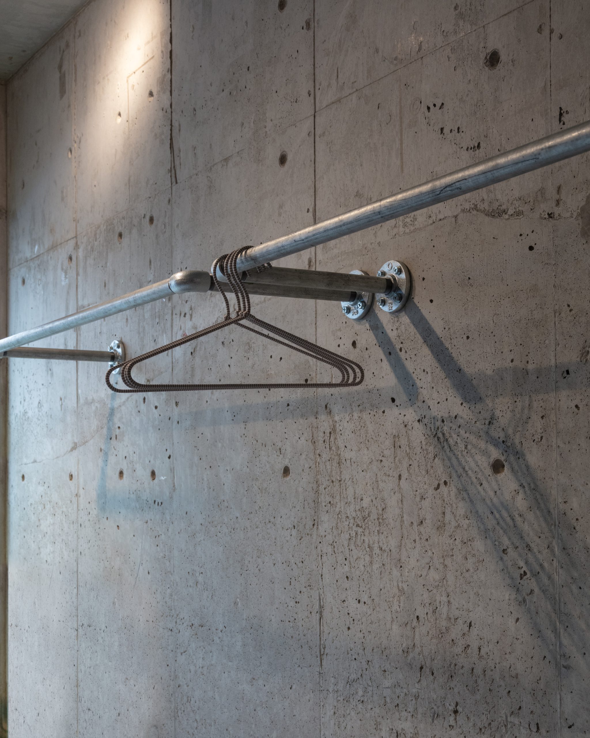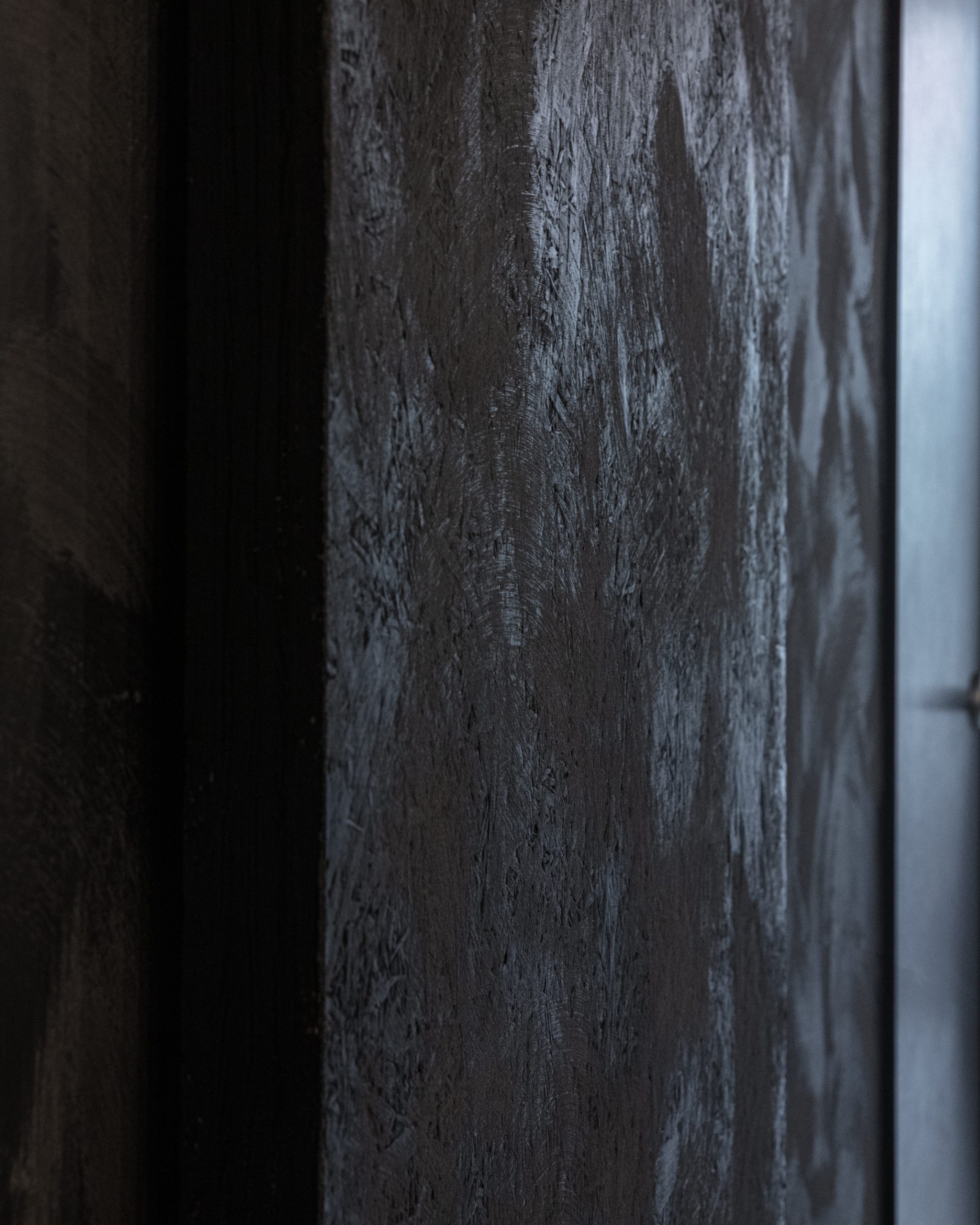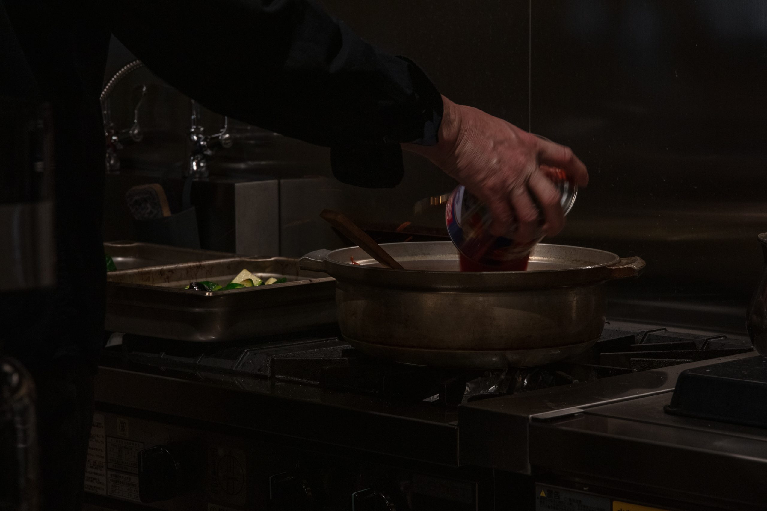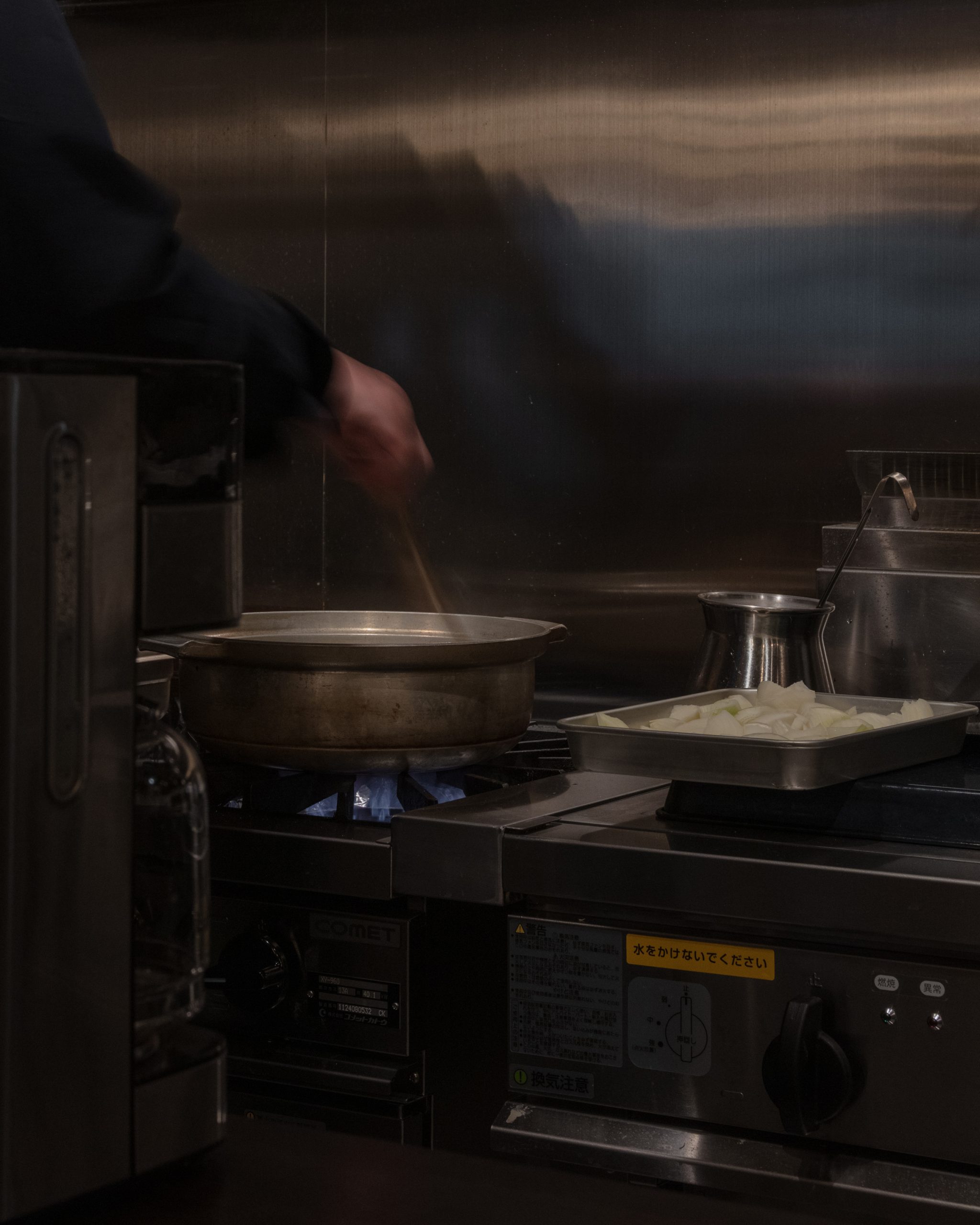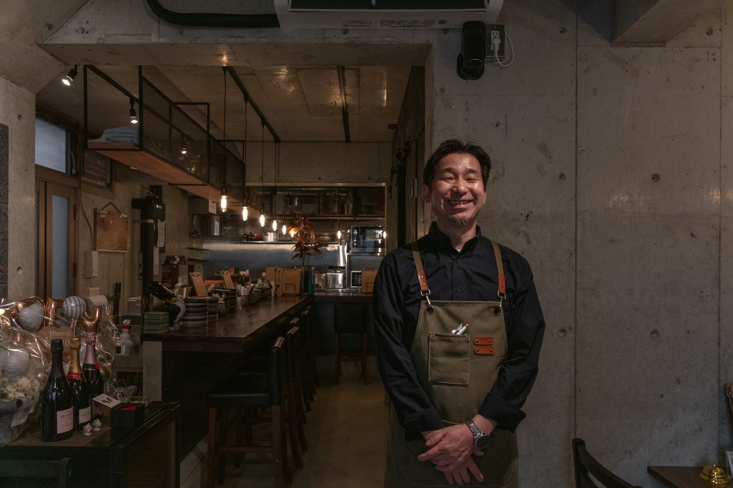 コンクリートむき出しの素材とアイアンの組み合わせが、モダンで洗練された空間を作り出しています。オープンキッチンスタイルのL型のカウンターからは厨房内が見渡せ、料理が作られる様子を楽しむことができます。カウンター席とは別にグループでのお食事が楽しめるテーブル席も配置できました。アクセントになるマットな黒い壁は、インダストリアルな雰囲気を強調しています。店内カウンターにはアラジンランプが配置され、温かみのある光がインダストリアルな空間に柔らかさを加えています。洗練されたデザインと心地よい雰囲気の中で、フレンチ料理をカジュアルに楽しむことができる特別な場所です。ぜひ一度足を運んでみてください。