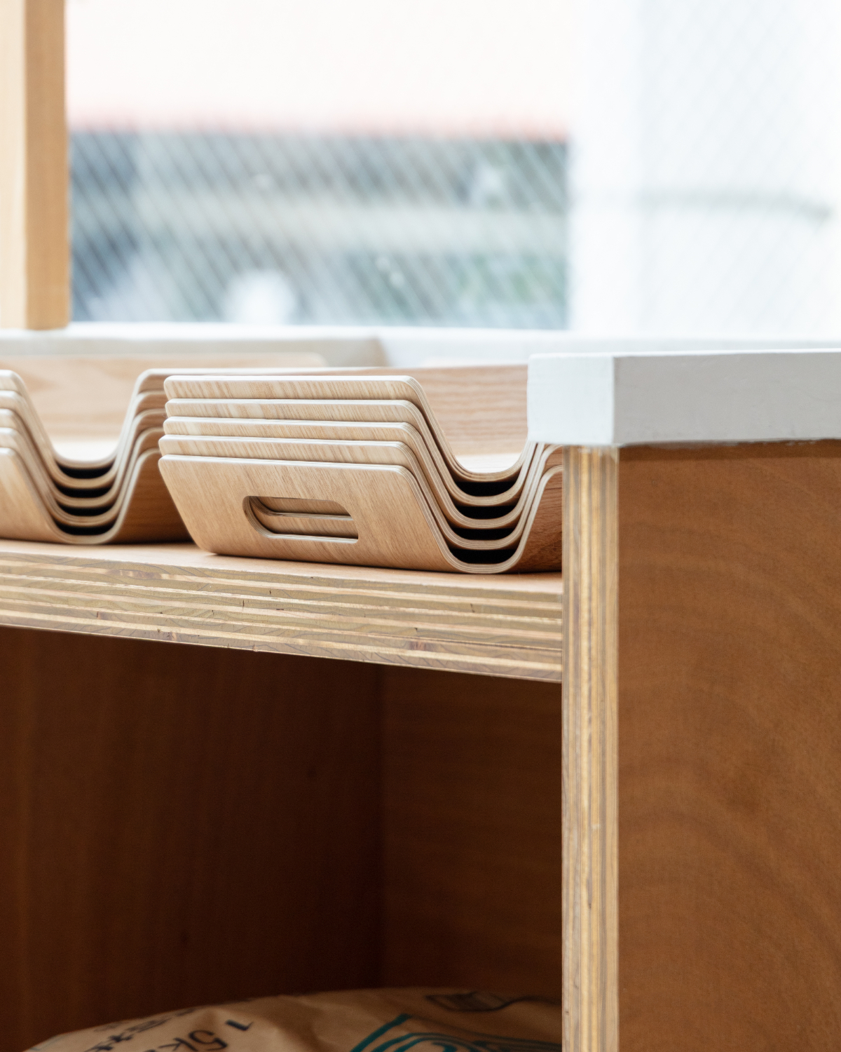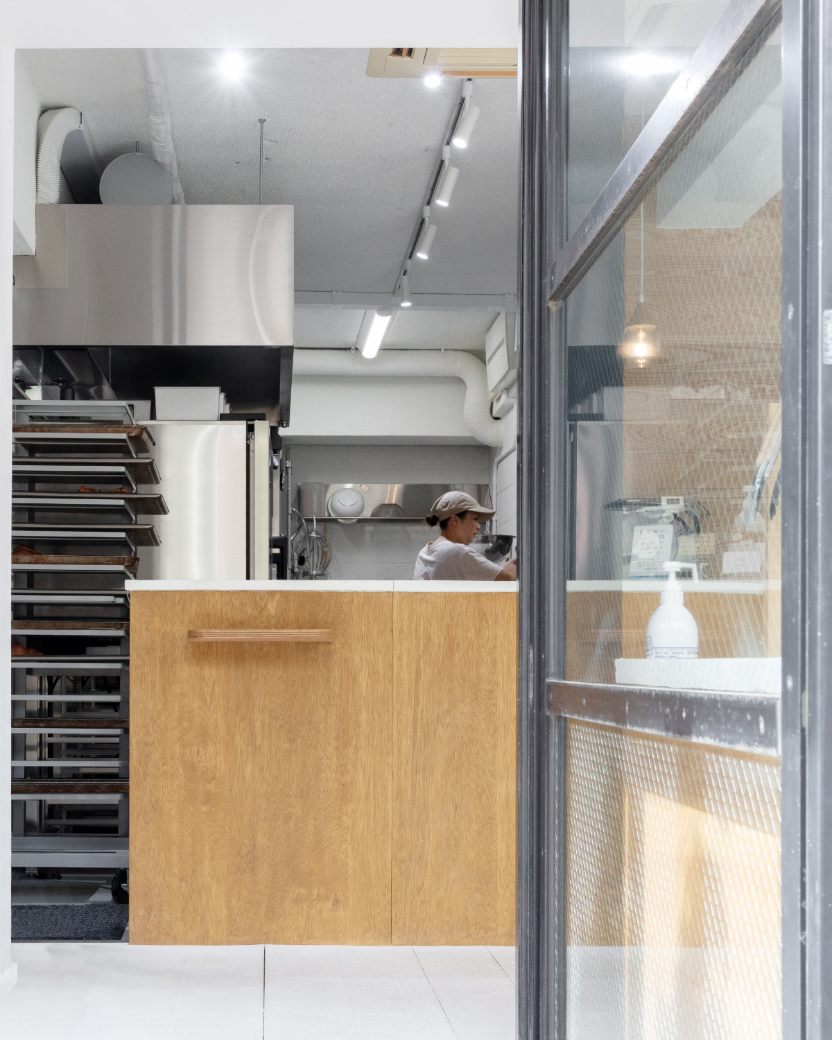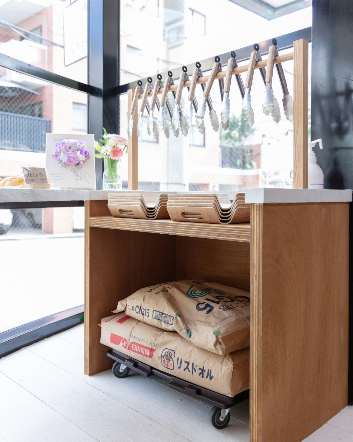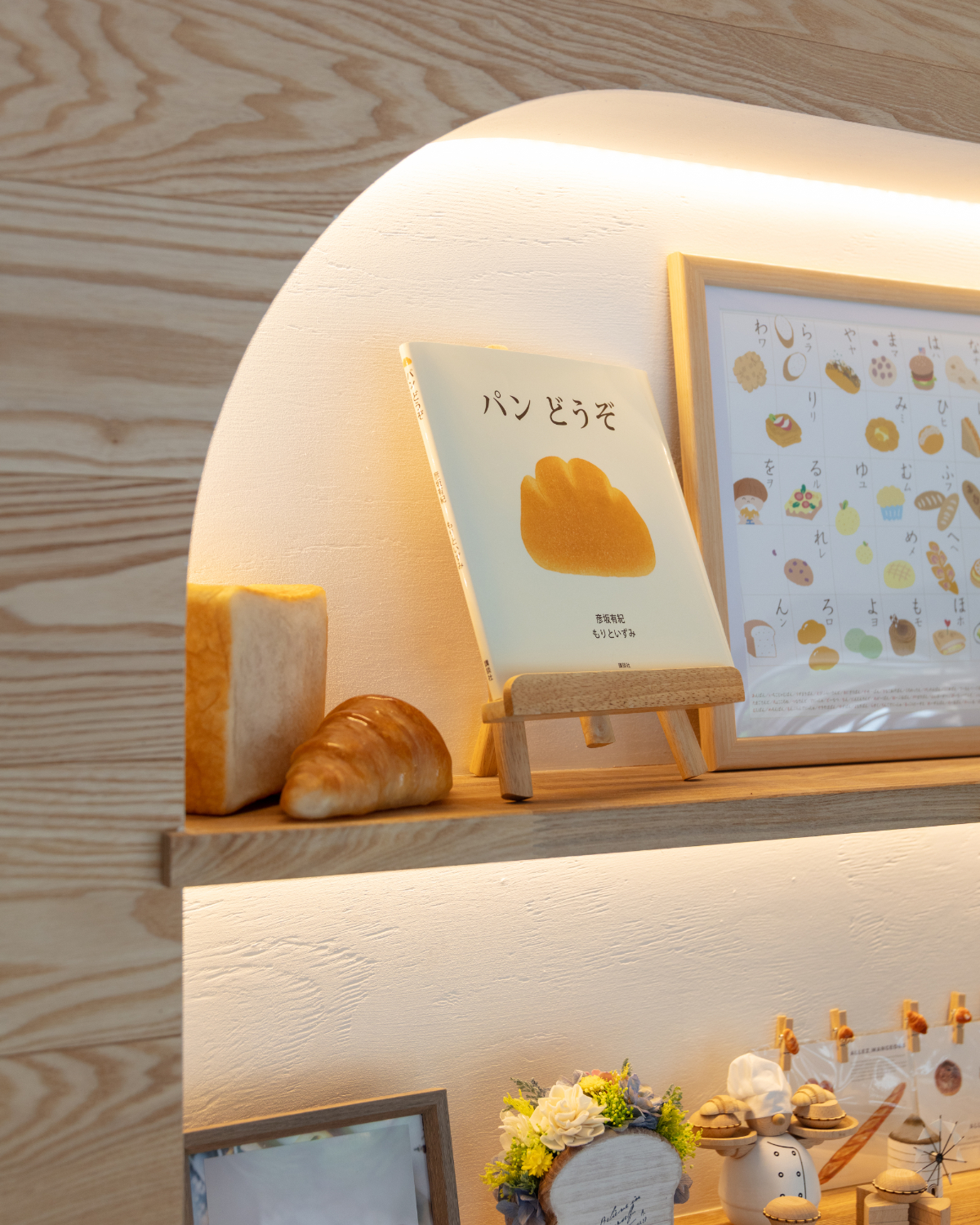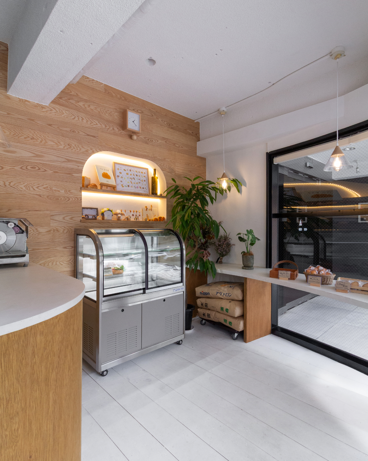 トング掛けなど細部に至るまで丁寧に造作を施し、デザイン性と機能性を両立。開放感と清潔感に満ちた訪れる人の心を引き付ける可愛いパン屋さんができました。
