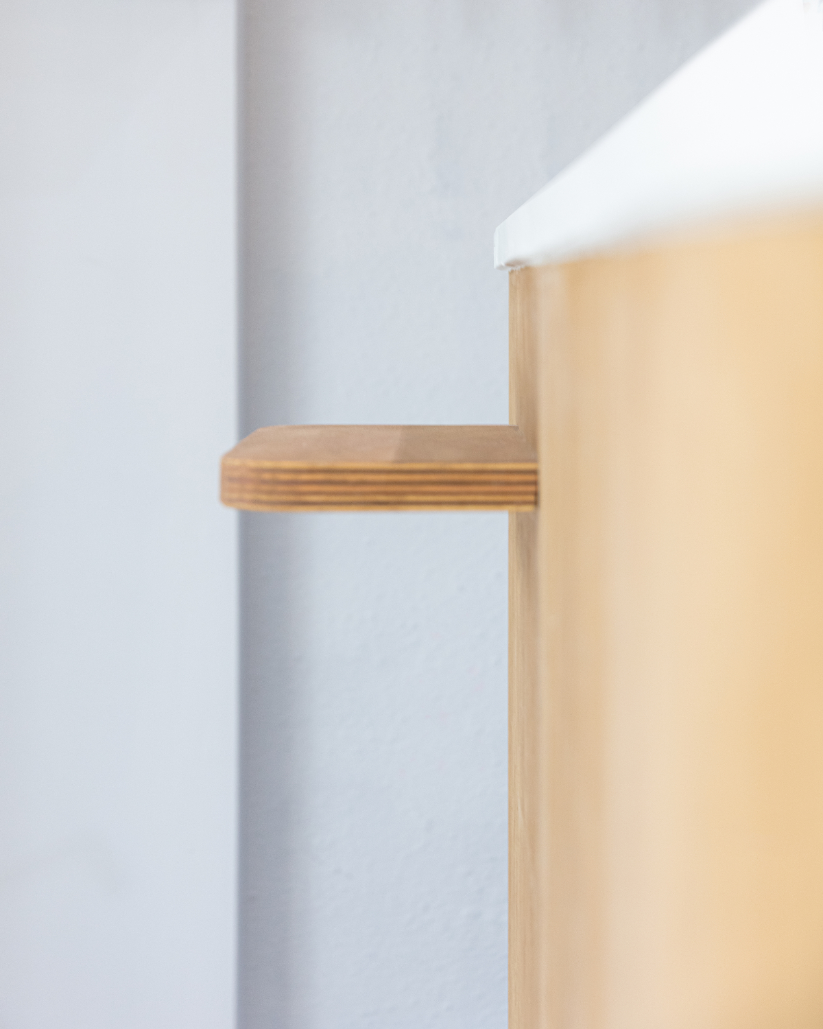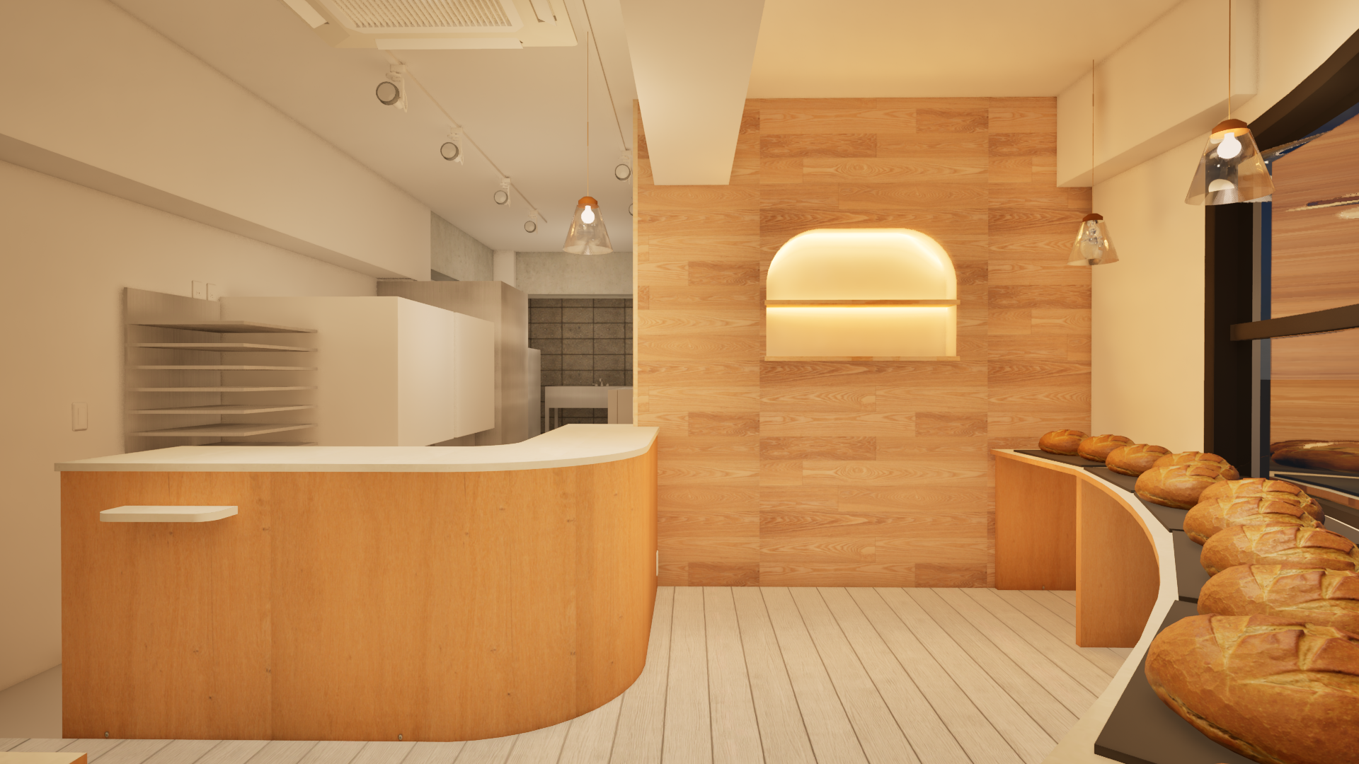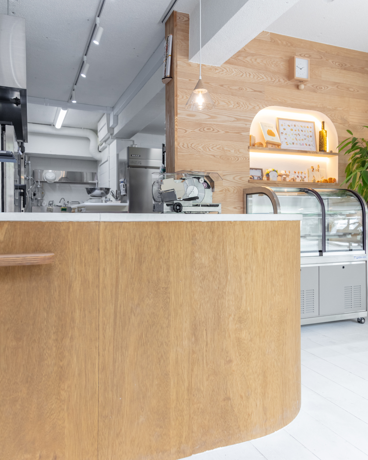 大きな窓から差し込む自然光を最大限に生かし、緩やかなカーブを描く陳列台を白のモールテックスで仕上げました。曲線が生み出す柔らかさと素材の持つ上質な質感が空間に清潔感と開放感をもたらします。視界を遮らない様に脚のデザインにも拘りました。タモ材の羽目板で造作したRのニッチには間接照明を設け、木の温もりと光の陰影が空間を優しく引き立てます。カウンターもR曲線と白いモールテックスで統一し、空間全体に一体感と上質なリズムを演出しました。