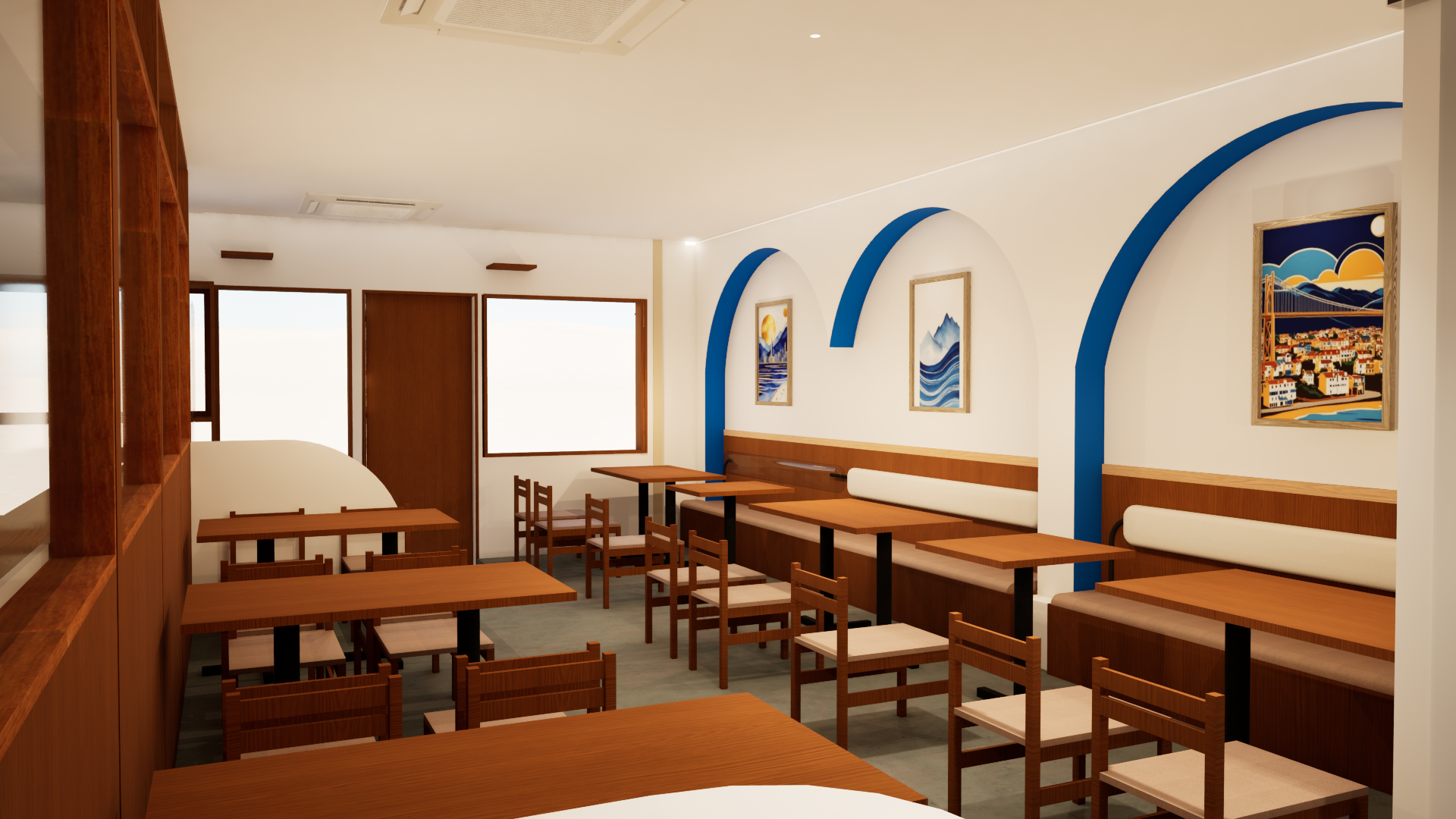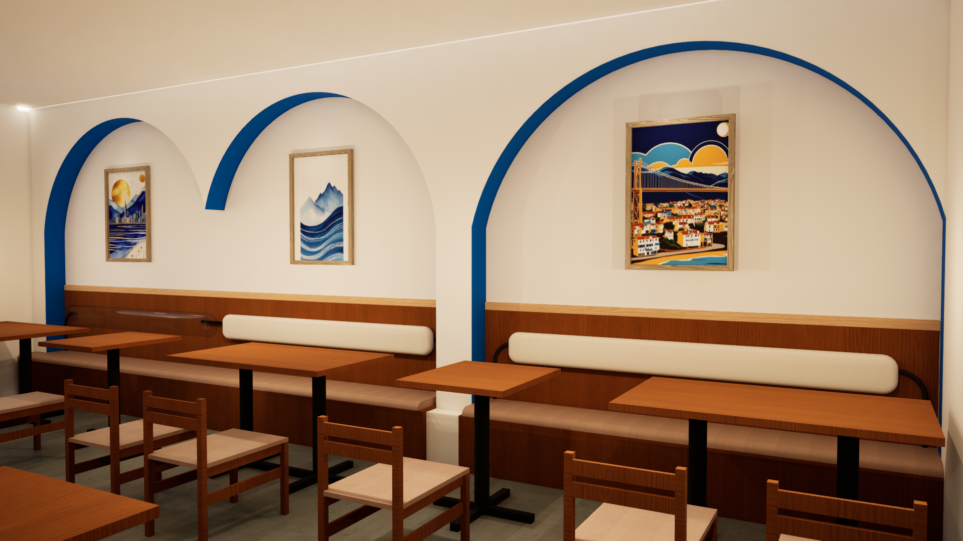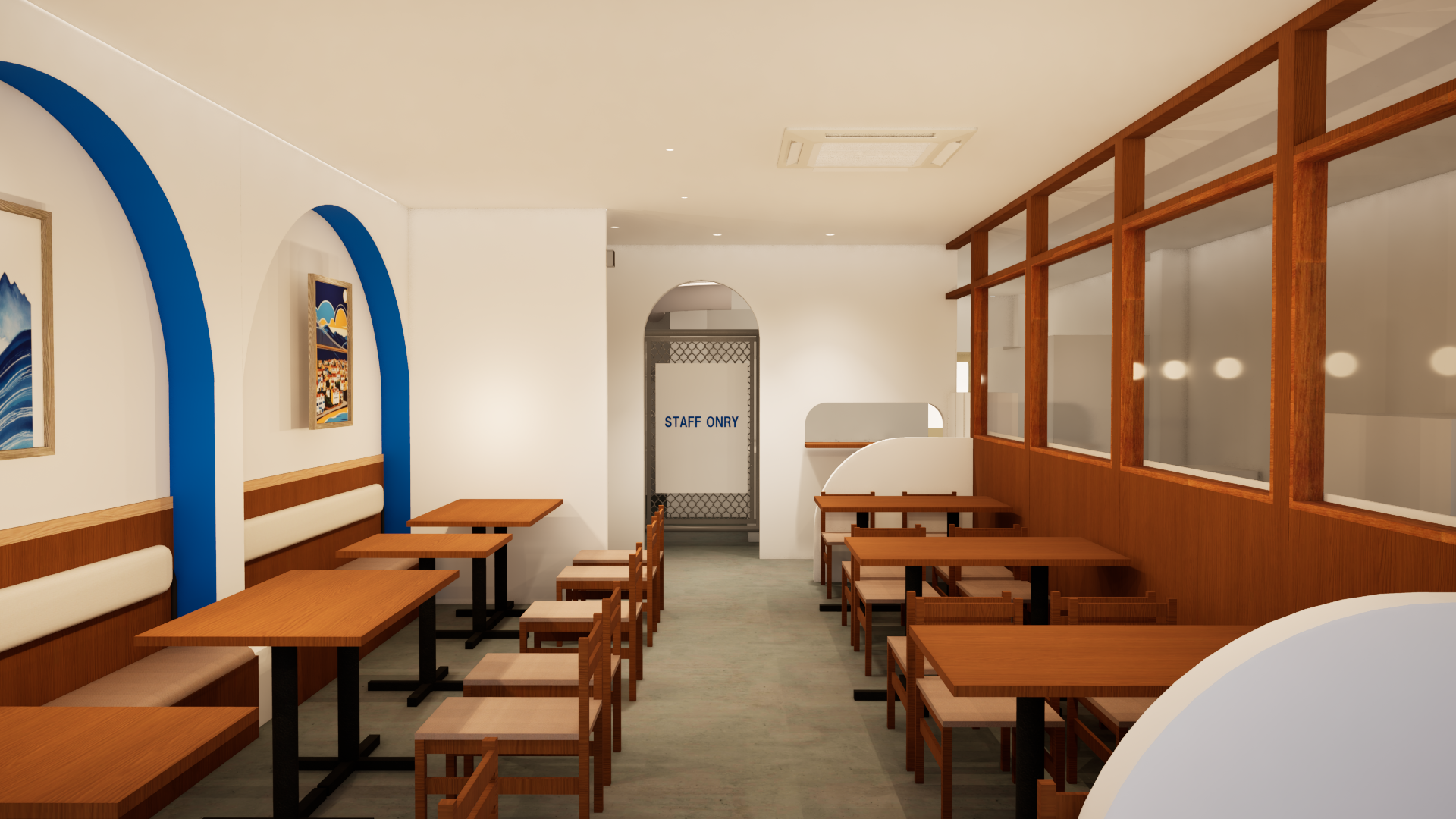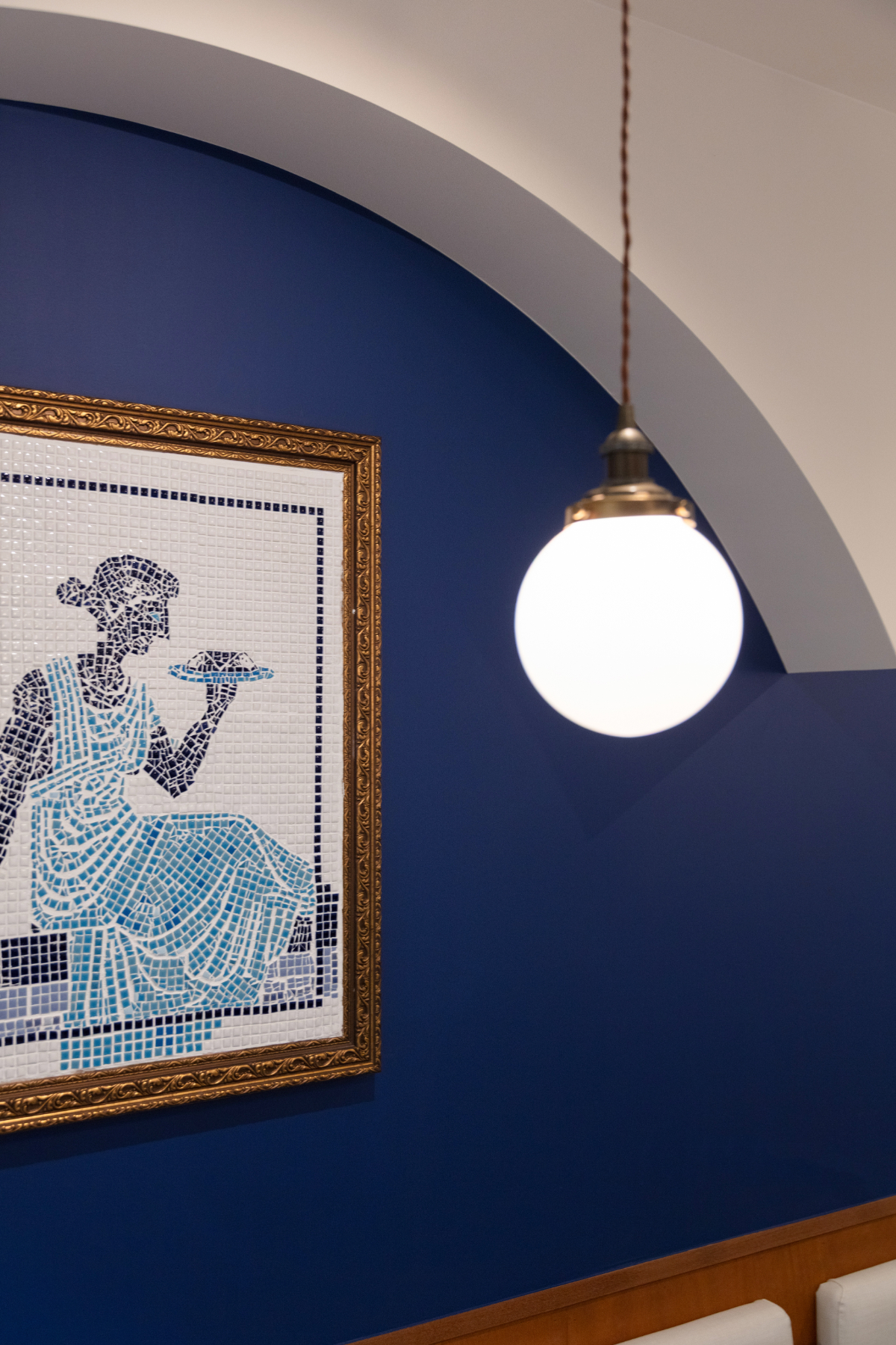 どこか地中海のレストランを連想させるような落ち着きと高級感のある空間の仕上がりとなりました。