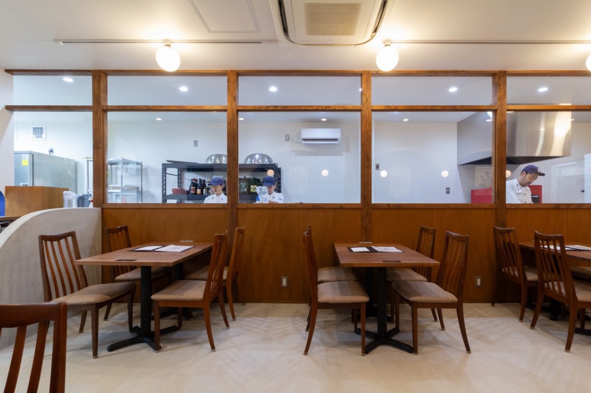 客席から繋がるデシャップは壁で遮ることなくガラス仕様にすることで店内全体が開放感かつ一体感のある空間となりました。