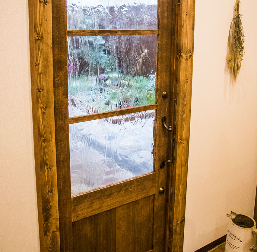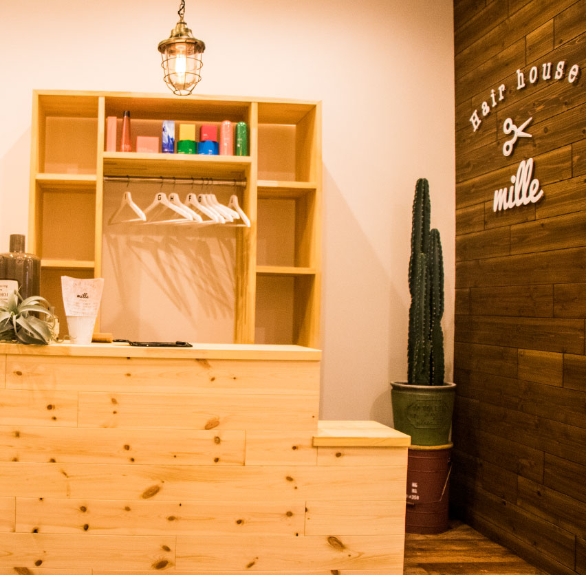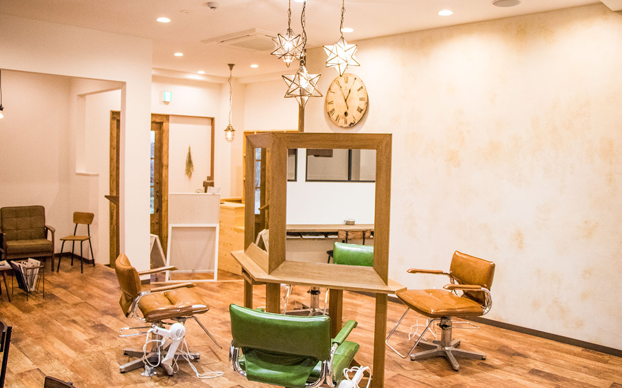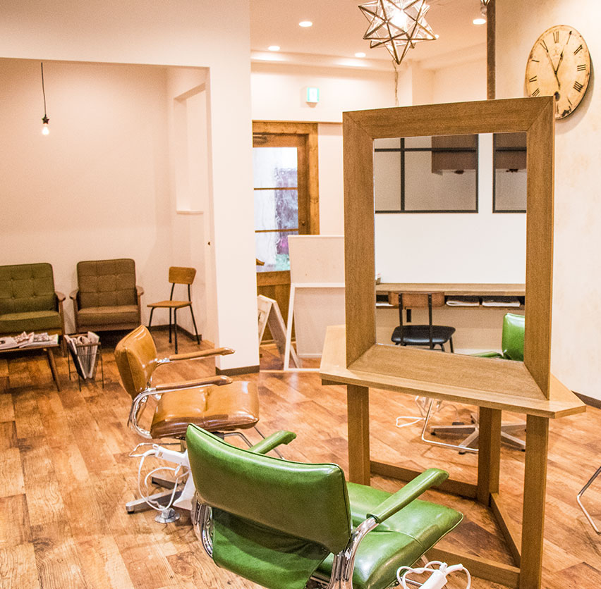 木彫主体の明るい雰囲気。お客さんを出迎えてくれるオリジナルの4面体のカットミラーがお店のシンボル。お客さんと店主の距離がぐっと縮まる美容院です。